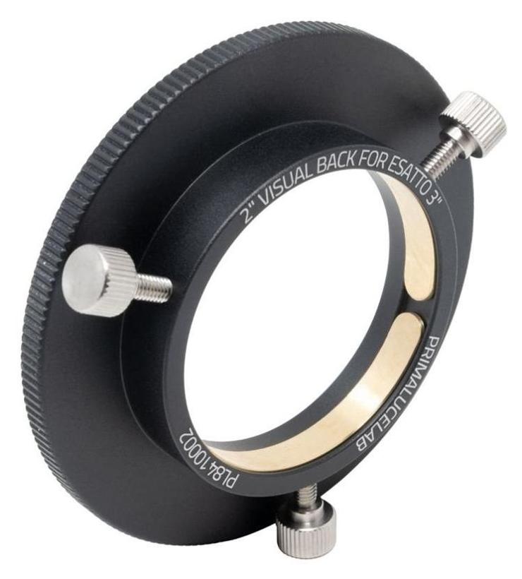 2" visual back for ESATTO 3" and ARCO 2" (PrimaLuceLab, SKU: PL8410002) umożliwia szybkie podłączenie standardowych akcesoriów 2" (okularów, nasadek kątowych, reduktorów, aparatów z adapterem 2") do wyciągu ESATTO 3" lub rotatora ARCO 2". Adapter wkręca się w przedni gwint urządzenia, gwarantując osiowe i pewne mocowanie przy minimalnym przyroście back-focusu.