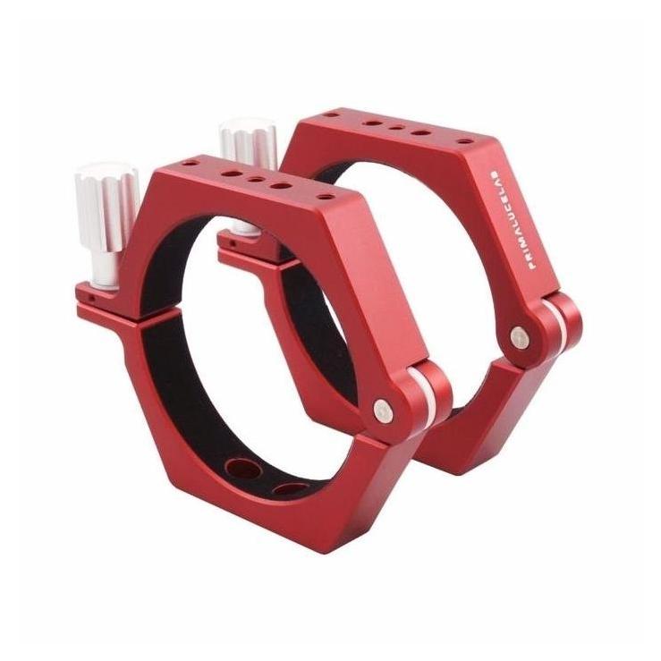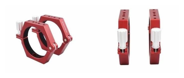 95 mm PLUS support rings (PrimaLuceLab, SKU: PLLANSU95P) umożliwiają sztywne zamocowanie tubusów o średnicy około 95 mm – na przykład refraktorów Takahashi FSQ-85, FS-78, FC-100 DF/DL – w ekosystemie mechanicznym PLUS. Frezowane z aluminium 6061-T6 i twardo anodowane na charakterystyczny czerwony kolor, pierścienie pozwalają jednocześnie zainstalować płytę szynową lub prowadnice guidera zarówno pod, jak i nad teleskopem.
