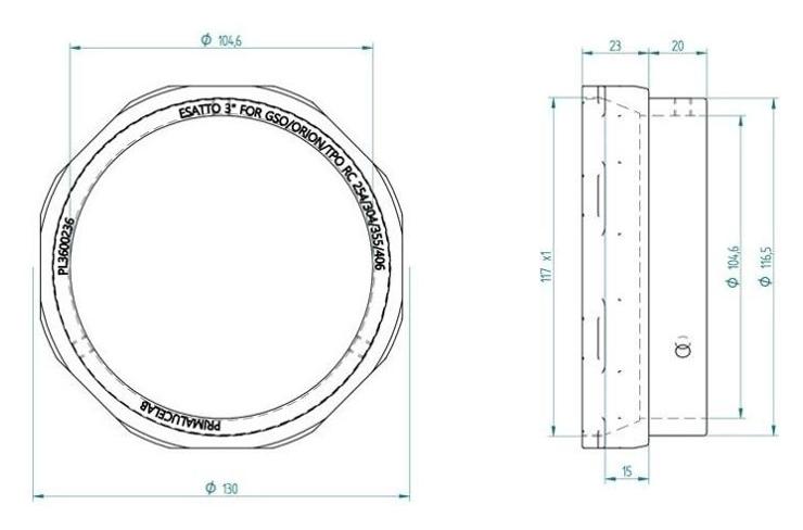 Adapter ESATTO 3" → GSO / Orion / TPO Ritchey-Chrétien 10", 12", 14" i 16" (gwint M117 × 1) (PrimaLuceLab, SKU: PL3600236) pozwala zamontować zdalnie sterowany wyciąg ESATTO 3" w większych teleskopach RC. Optyczna grubość 43 mm umożliwia zachowanie pełnego budżetu back-focusu, a aluminiowy kołnierz wkręca się bezpośrednio w tylny gwint M117 × 1, tworząc sztywne, osiowe połączenie.