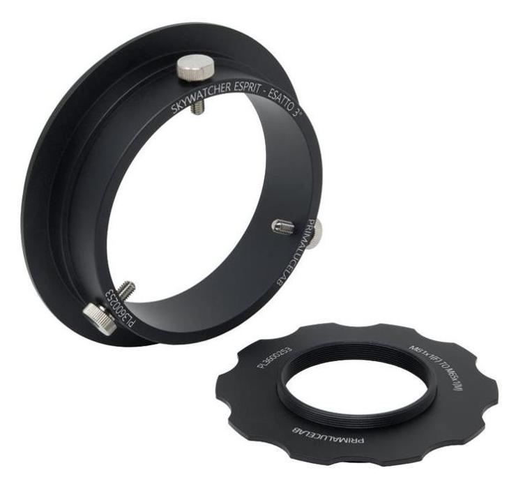 Adapter ESATTO 3" → Sky-Watcher ESPRIT 120 ED / 150 ED (PrimaLuceLab, SKU: PL3600253) umożliwia montaż precyzyjnego, zdalnie sterowanego wyciągu ESATTO 3" w miejsce fabrycznego fokusera apochromatów ESPRIT 120 ED oraz ESPRIT 150 ED. Kołnierz wykorzystuje seryjne otwory tylnej celi tubusu — instalacja jest całkowicie odwracalna, a projektowy back-focus refraktora pozostaje bez zmian.