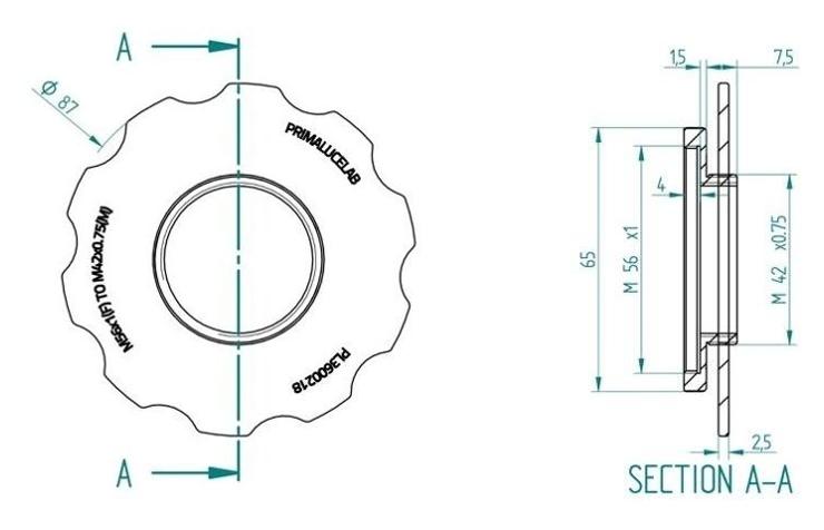 Adapter M56 × 1 → T-2 (M42 × 0,75) z pierścieniem stopującym (PrimaLuceLab, SKU: PL3600218) umożliwia podłączenie kamer i akcesoriów w standardzie T-2 do wyciągu ESATTO 2" lub rotatora ARCO 2". Zintegrowany pierścień pozwala powtarzalnie ustawić kąt kamery, ułatwiając kadrowanie przy minimalnym przyroście back-focusu.