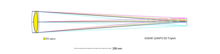 Teleskop ten skonstruowany został jako klasyczny tryplet apochromatyczny z przerwą powietrzną. Aby zadbać o jak najlepszą korekcję aberracji chromatycznych, projektanci firmy Askar postawili na rozwiązanie znane z najdroższych, flagowych apochromatów, a mianowicie zastosowanie soczewki ze szkła o obniżonej dyspersji (ED). W celu wyeliminowania ryzyka powstawania odblasków wnętrze tubusu wyposażono w rozbudowany system baffli i dodatkowo pomalowane zostało matową farbą.