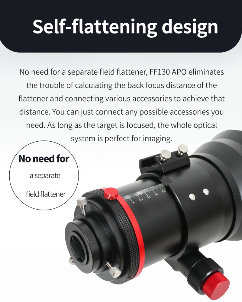Oprócz nienagannych parametrów optycznych ZWO FF130 APO odznacza się wysoką jakością oraz precyzją wykonania elementów mechanicznych. Solidny wyciąg pozwala na montaż nawet najcięższych kamer astronomicznych, a pierścienie montażowe i stopka Losmandy wykonane w technologii CNC gwarantują pełną stabilność tubusu.