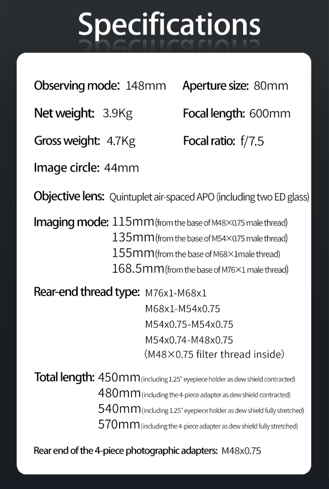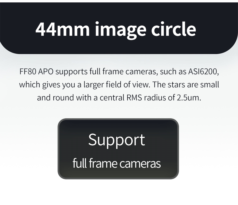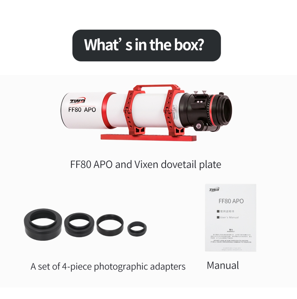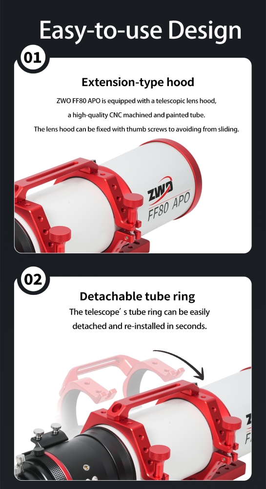 Oprócz nienagannych parametrów optycznych ZWO FF80 APO odznacza się wysoką jakością oraz precyzją wykonania elementów mechanicznych. Solidny wyciąg pozwala na montaż nawet najcięższych kamer astronomicznych, a pierścienie montażowe i stopka Losmandy wykonane w technologii CNC gwarantują pełną stabilność tubusu.