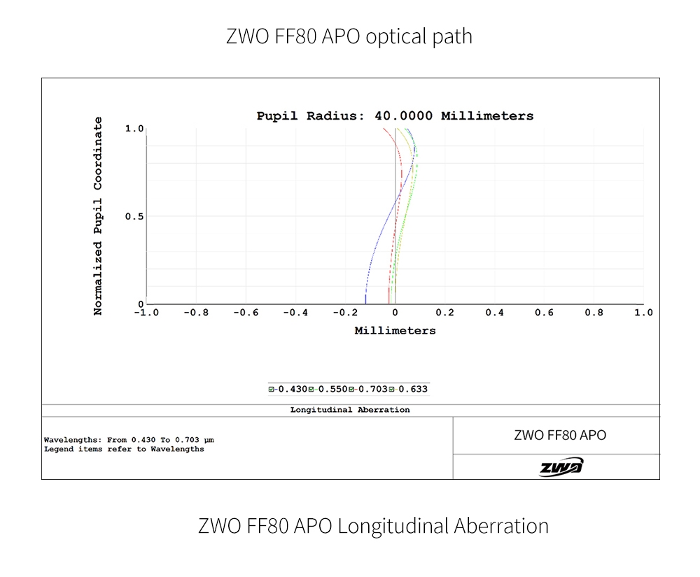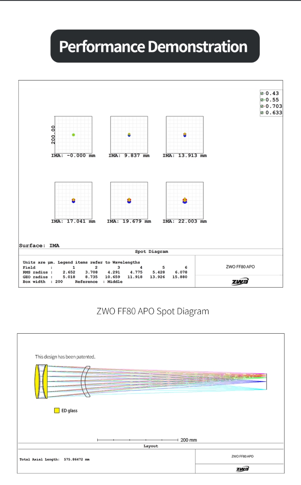 Teleskop ten to zaawansowany, czteroelementowy apochromat z przerwą powietrzną. Aby zadbać o jak najlepszą korekcję aberracji chromatycznych, firma ZWO postawiła na rozwiązanie znane z najdroższych, flagowych astrografów, a mianowicie zastosowanie dwóch soczewek wykonanych ze szkła o obniżonej dyspersji (ED). Oprócz znakomitego odwzorowania barw, ZWO FF80 APO charakteryzuje się zachowaniem znikomej krzywizny pola, dzięki czemu nawet bez użycia dodatkowego flattenera, obraz na brzegu klatki wolny jest od zauważalnych zniekształceń.