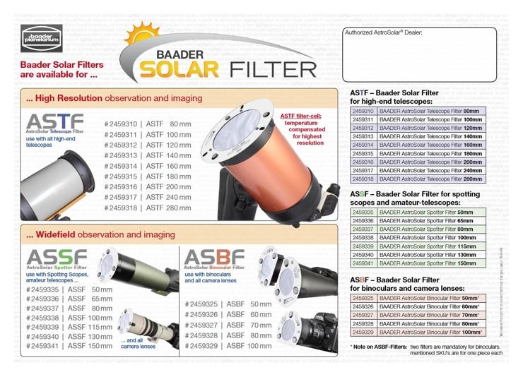 Profesjonalny filtr słoneczny wykonany z precyzyjnie wyciętej laserowo, metalowej celi, w której umieszczono oryginalną folię mylarową Baader Planetarium AstroSolar® OD=5,0. Dokładna regulacja średnicy mocowania umożliwia zamocowanie filtra na dowolnym teleskopie astronomicznym, o aperturze od 230 do 250 mm. Folia mylarowa o gęstości optycznej OD=5,0 jest filtrem o wysokiej jakości obrazu przewyższającej wiele popularnych filtrów szklanych dostępnych na rynku. Bezpieczne, estetyczne i trwałe mocowanie w formie aluminiowego pierścienia nie nagrzewa się i nie deformuje pod wpływem słonecznego ciepła, przez co zapewnia trwałe mocowanie dla folii. Jest to filtr słoneczny dający najwyższą na rynku jakość obrazu.