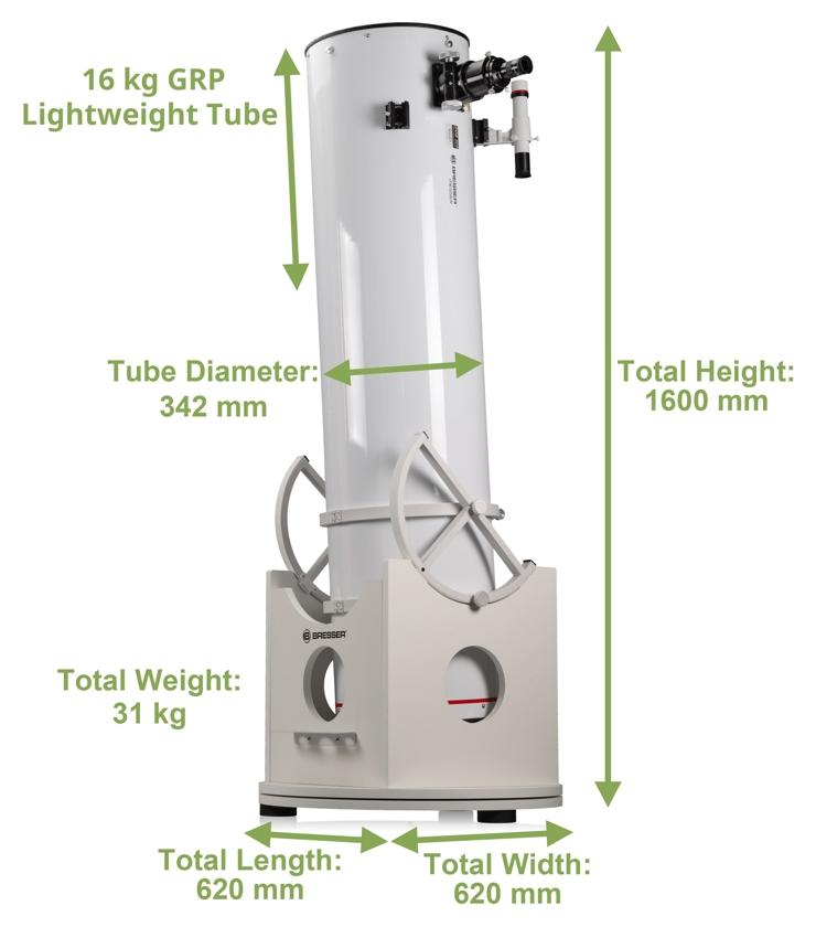 Bresser Messier Dobson 12" NT-305/1525 to klasyczny reflektor Newtona o aperturze 305 mm i światłosile f/5. Optyka tego teleskopu wykonana została z najwyższą precyzją, dzięki czemu pozwoli on cieszyć się widokami o bardzo dobrej ostrości, kontraście i praktycznie niezauważalnej aberracji chromatycznej. Zwierciadło główne tej tuby optycznej wykonane zostało ze szkła typu H-PZ33 charakteryzującego się obniżonym współczynnikiem rozszerzalności temperaturowej, dzięki czemu teleskop jest mniej wrażliwy na zmiany temperatury otoczenia.