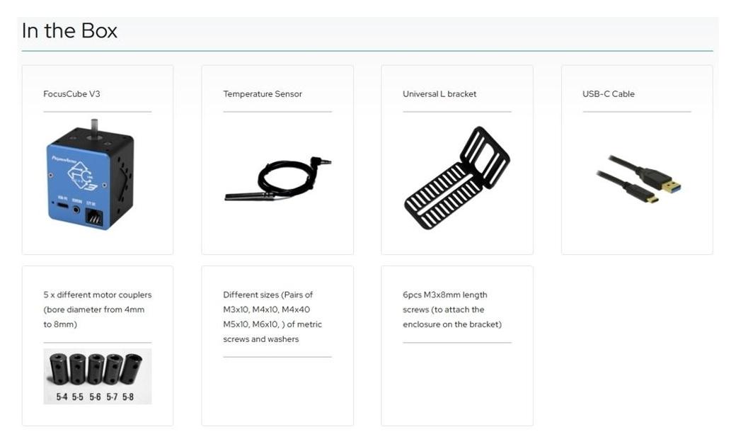 Uniwersalny regulowany uchwyt (L-bracket) umożliwia montaż FocusCube v3 do szerokiej gamy wyciągów teleskopowych. W zestawie znajduje się pięć solidnych sprzęgieł silnika o średnicach od 4 mm do 8 mm, co pozwala na dopasowanie do większości wyciągów dostępnych na rynku. Konstrukcja uchwytu pozwala na precyzyjne dopasowanie pozycji silnika do osi focusera.