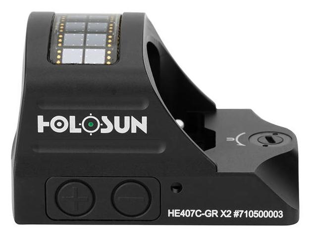 HE407C-GR jest otwartym celownikiem kolimatorowym przeznaczonym do stosowania na pistoletach. Wyposażony jest w zieloną diodę Holosun Super LED o żywotności baterii do 50k godzin, kropkę 2MOA, system Solar Failsafe oraz Shake Awake.