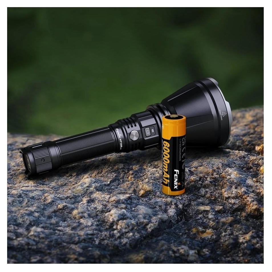 HT18R V2.0 korzysta z akumulatora ARB-L21-6000 o dużej pojemności, ładowanego przez port USB-C. Wskaźnik LED informuje o stanie energii po włączeniu: zielony (100–85%), zielony migający (85–50%), czerwony (50–25%), czerwony migający (25–1%). Korpus wykonano z aluminium 6061-T6, uszczelniono zgodnie z IP68 i zabezpieczono przed przegrzaniem, przeładowaniem i nadmiernym rozładowaniem akumulatora.