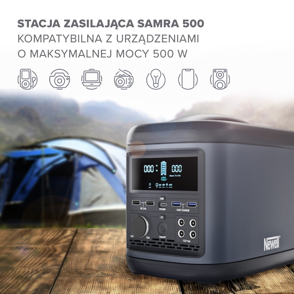 Newell Samra 500 to nowoczesna, wielofunkcyjna stacja zasilająca przeznaczona do zastosowania wszędzie tam, gdzie brak jest możliwości użycia zasilania sieciowego. Ze względu na swoją niewielką wagę i łatwość przenoszenia stacja doskonale sprawdzi się zarówno na kempingu czy podczas biwaku, a także jako awaryjne domowe źródło zasilania.