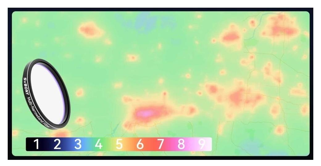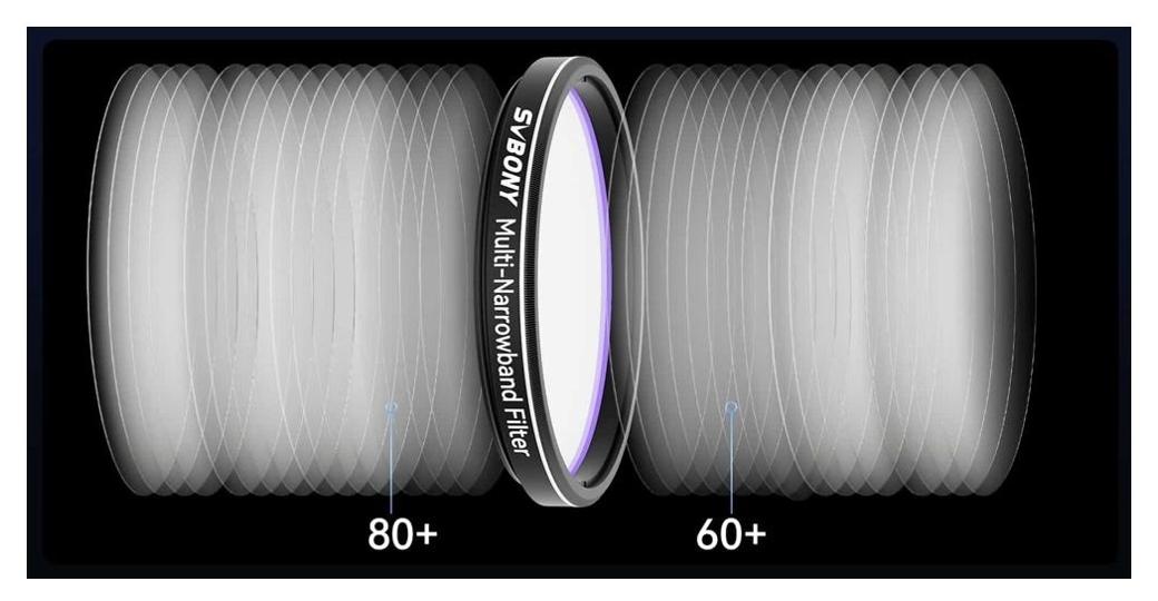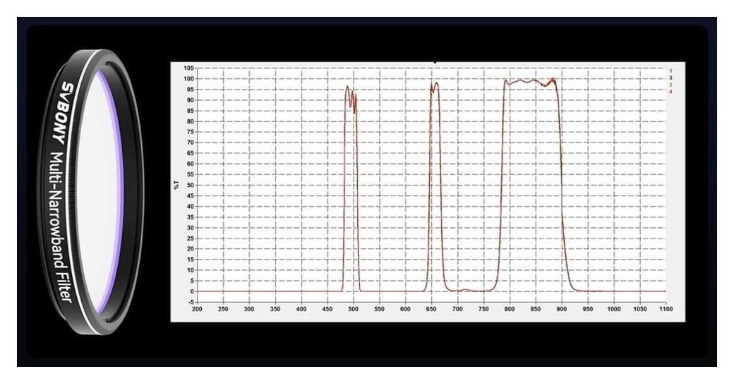 Svbony SV240 Multi-Narrowband Galaxy & Nebula NIR 1,25" to profesjonalny filtr astronomiczny przeznaczony do astrofotografii prowadzonej w warunkach silnego zanieczyszczenia świetlnego – nawet do poziomu 8 w skali Bortle’a. Dzięki skutecznej blokadzie emisji charakterystycznej dla lamp sodowych i rtęciowych oraz wysokiej transmisji w kluczowych pasmach Hα, O-III i Hβ umożliwia uzyskiwanie szczegółowych zdjęć mgławic i galaktyk z terenów miejskich.