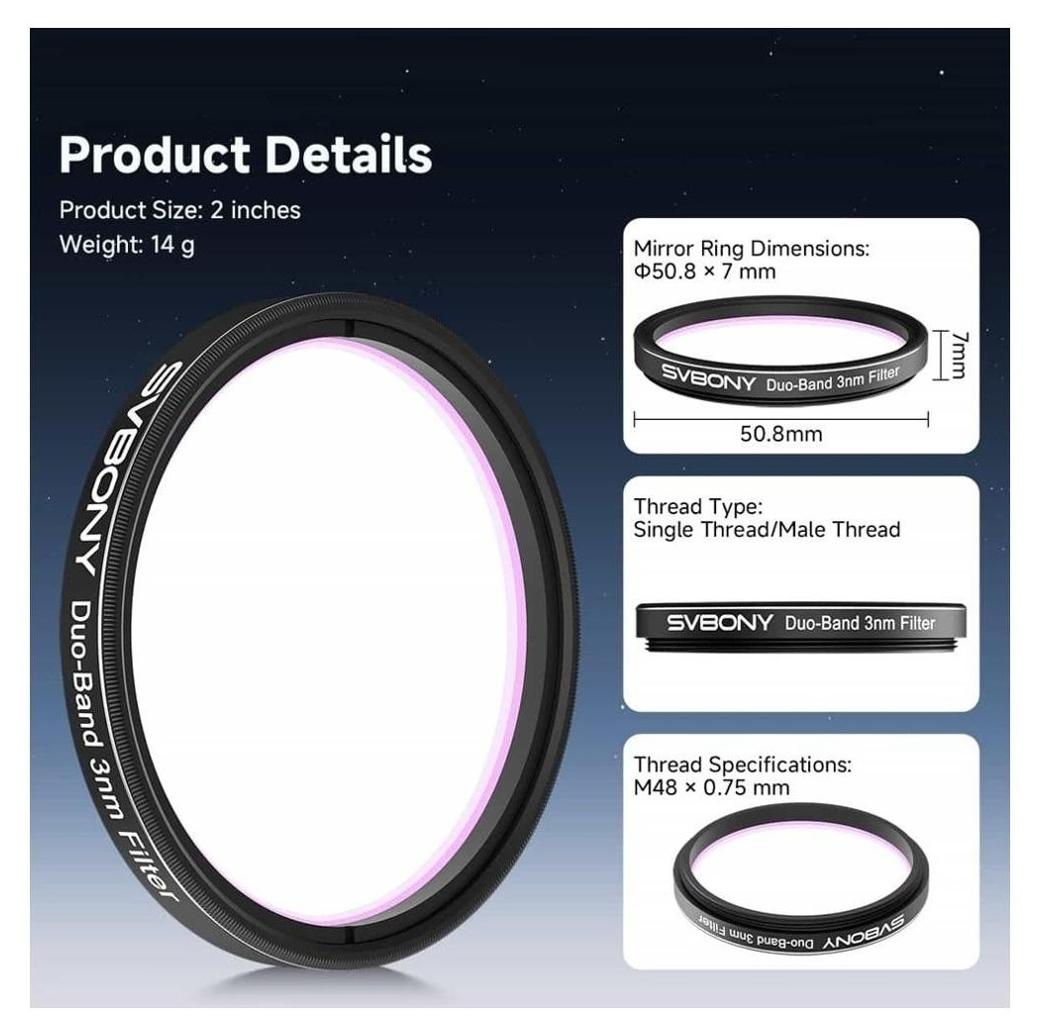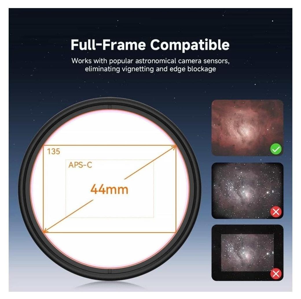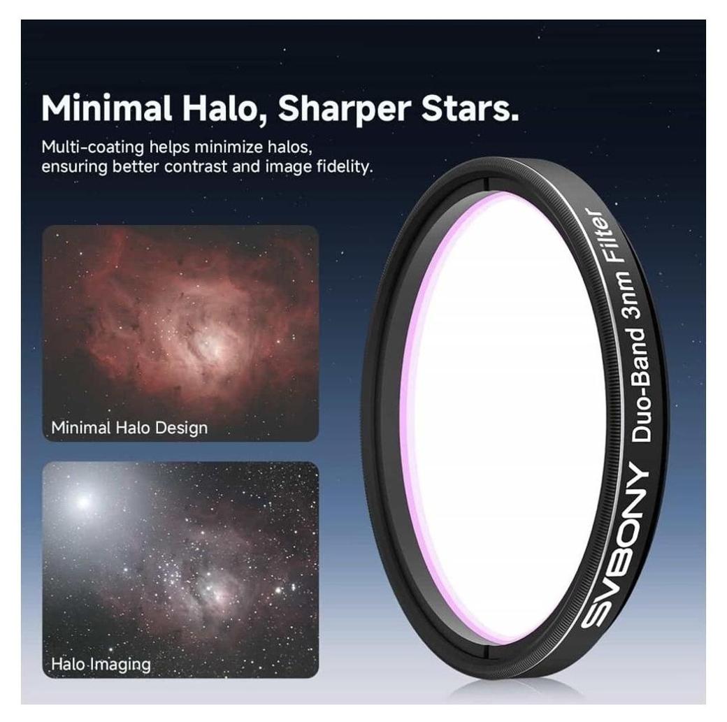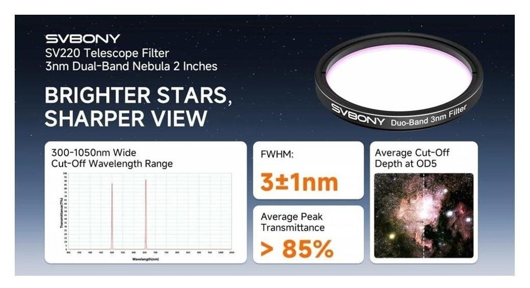 Filtr wąskopasmowy SVBONY SV220 2" łączy pasma H-alfa i OIII o bardzo wąskiej szerokości 3 nm, co pozwala na skuteczne wycinanie zanieczyszczeń świetlnych i tła nieba przy jednoczesnym podkreśleniu struktur mgławic emisyjnych oraz planetarnych. Konstrukcja zoptymalizowana do pracy z matrycami pełnoklatkowymi oraz obiektywami o szerokim polu widzenia zapewnia równomierną jasność w całym kadrze, od centrum po brzegi.