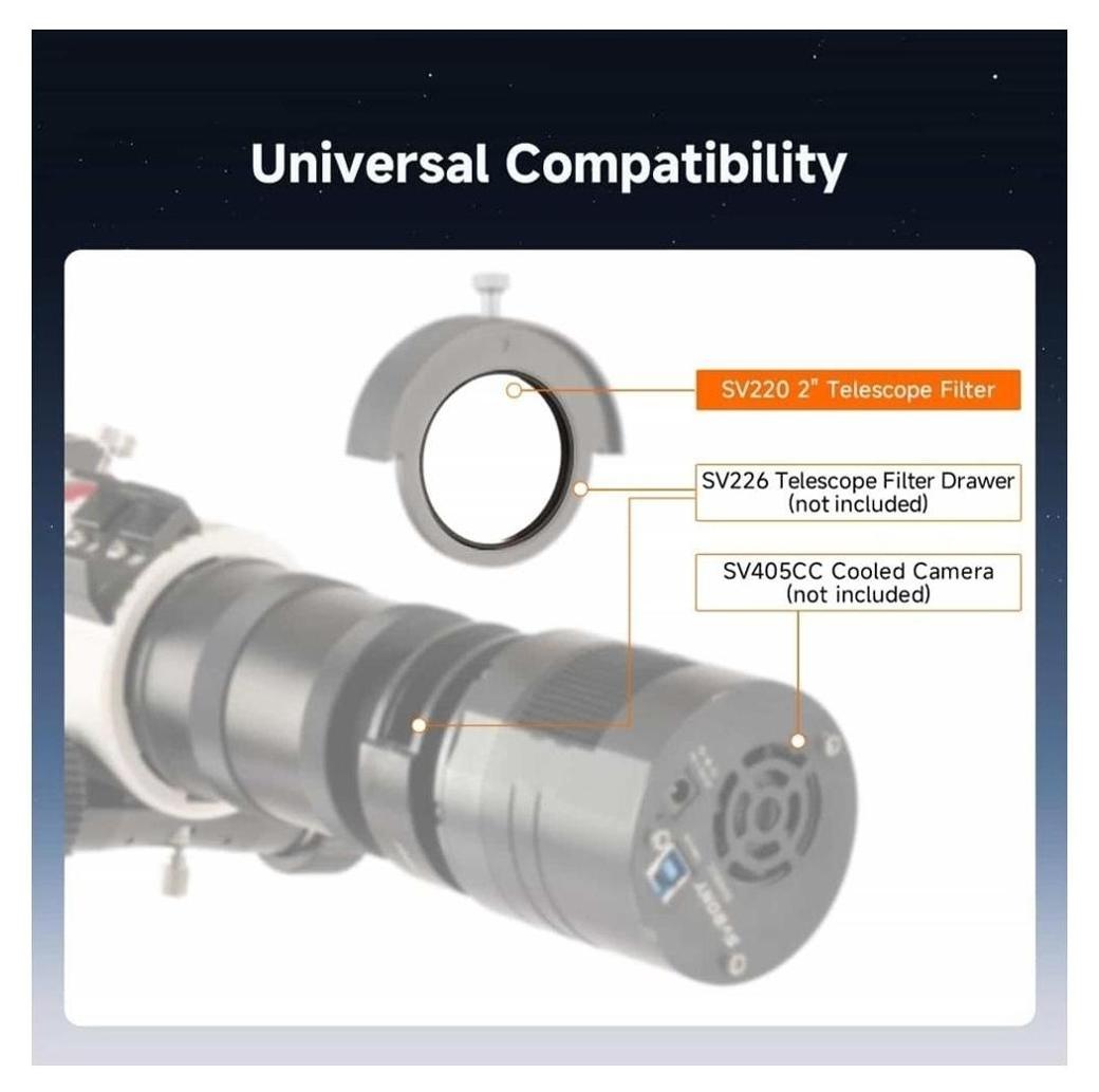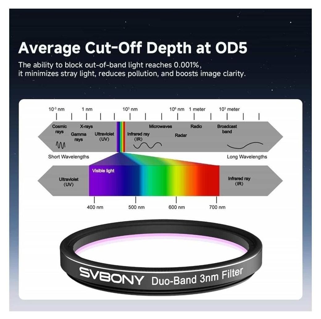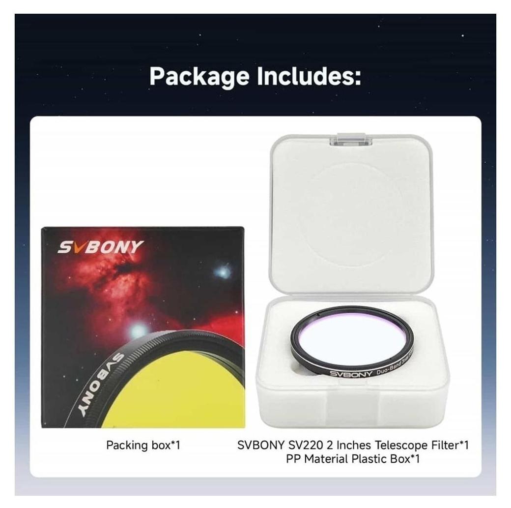 Filtr wąskopasmowy SVBONY SV220 2" łączy pasma H-alfa i OIII o bardzo wąskiej szerokości 3 nm, co pozwala na skuteczne wycinanie zanieczyszczeń świetlnych i tła nieba przy jednoczesnym podkreśleniu struktur mgławic emisyjnych oraz planetarnych. Konstrukcja zoptymalizowana do pracy z matrycami pełnoklatkowymi oraz obiektywami o szerokim polu widzenia zapewnia równomierną jasność w całym kadrze, od centrum po brzegi.