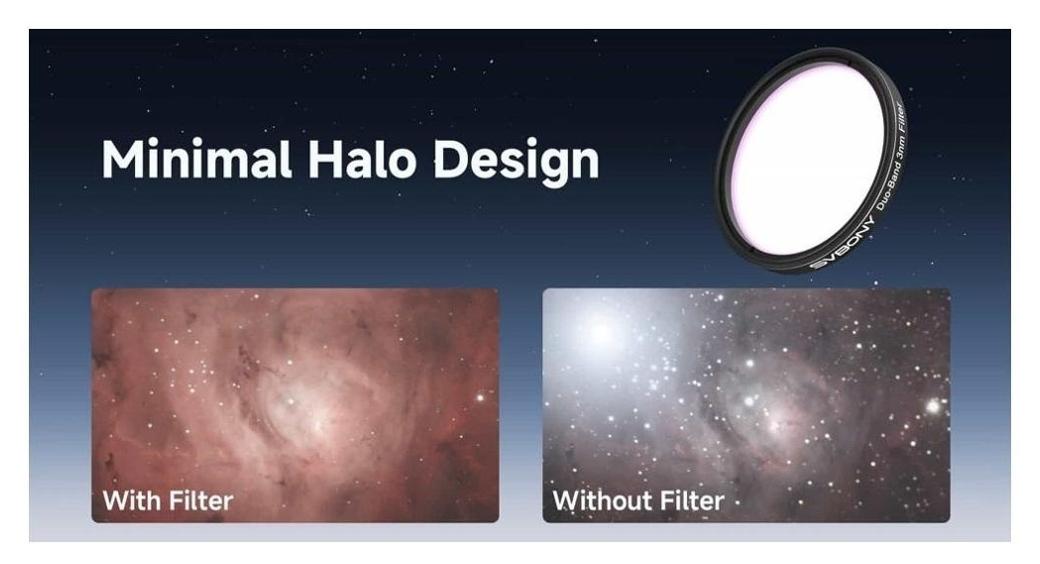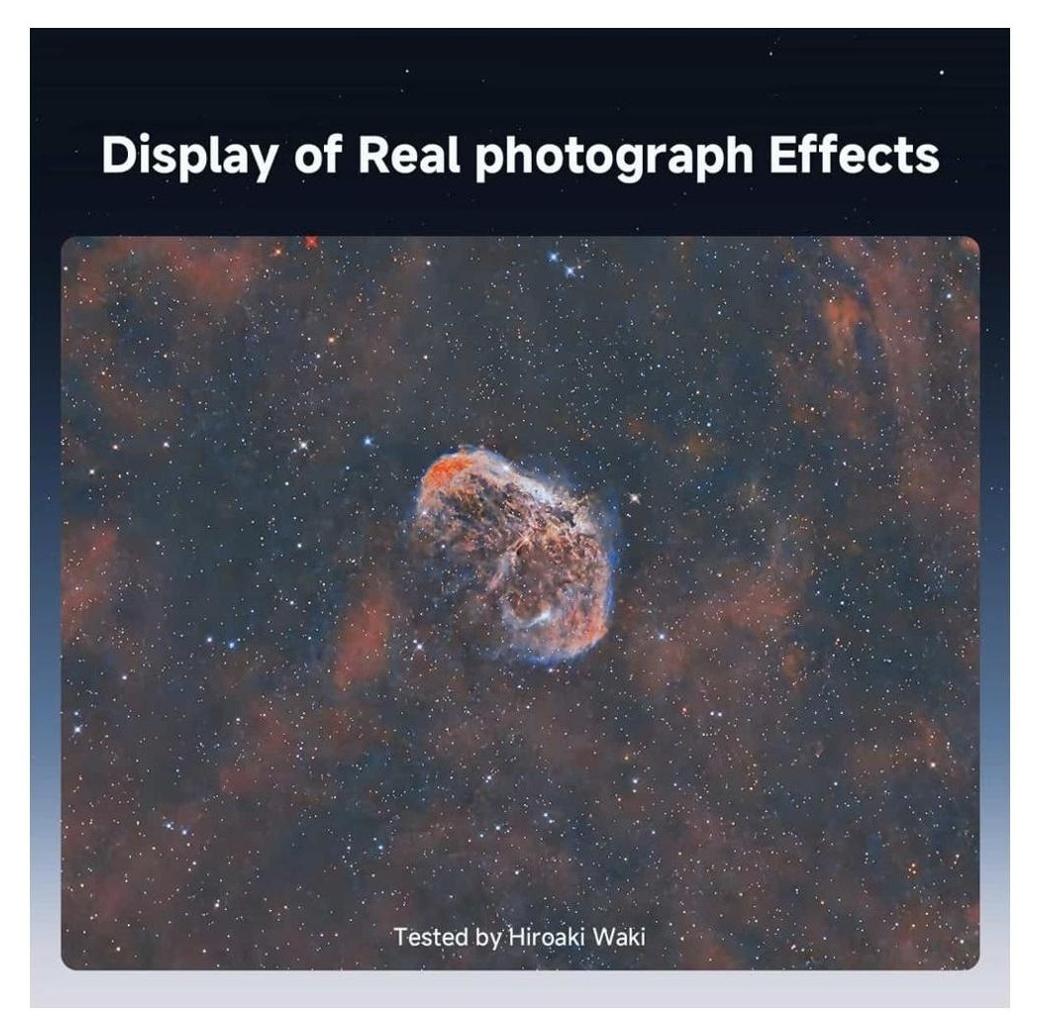 Powłoki o zminimalizowanych efektach halo skutecznie ograniczają niepożądane rozbłyski wokół jasnych gwiazd, a wysoka transmisja w liniach OIII i H-alfa umożliwia rejestrowanie dużej ilości detalu przy długich ekspozycjach. Filtr ma standardowy gwint M48×0,75 oraz oprawę 2" o średnicy 50,8 mm, dzięki czemu jest kompatybilny z większością współczesnych kamer i akcesoriów astrofotograficznych.
