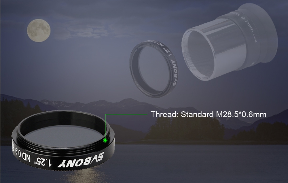 Svbony SV139 1,25" ND 0,6 to profesjonalny filtr księżycowy, który dzięki ograniczeniu ilości światła minimalizuje wpływ poświaty i umożliwia dostrzeżenie większej ilości szczegółów na powierzchni srebrnego globu.
