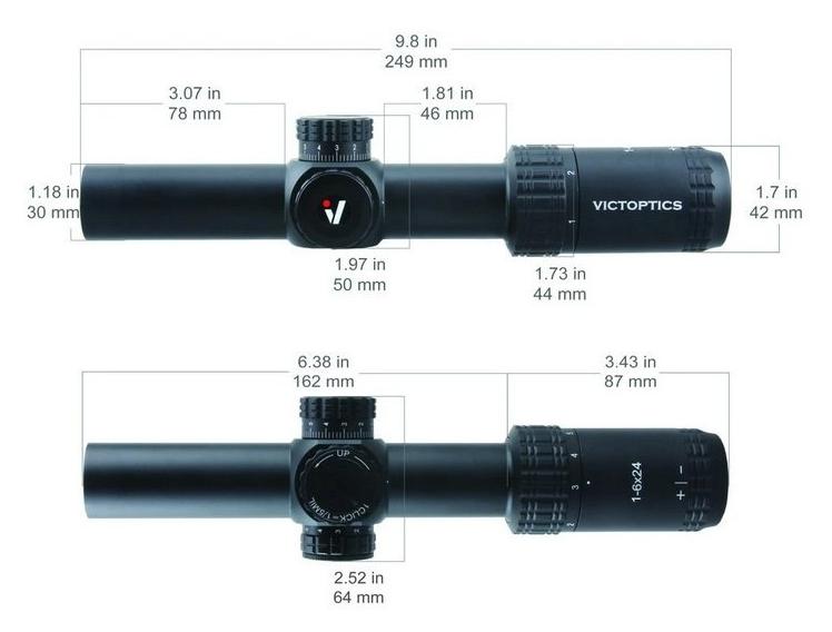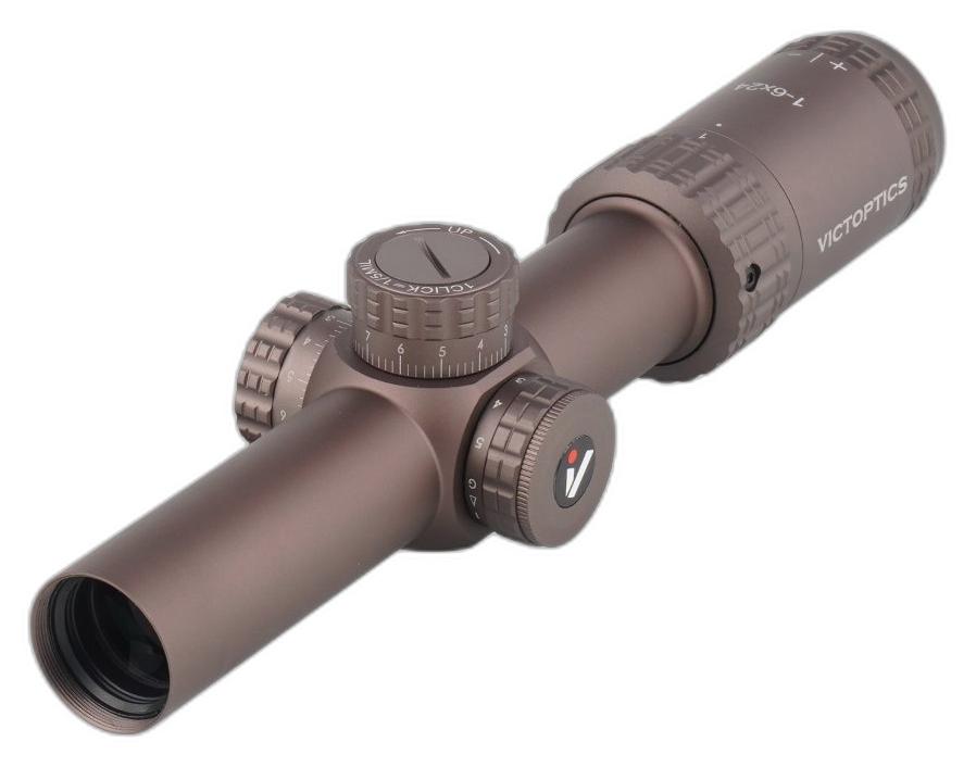 VictOptics luneta biegowa S6 1-6x24 SFP, tubus 30 mm, Burnt Brown to luneta celownicza o zmiennym powiększeniu 1-6x z obiektywem 24 mm. Model S6 wyposażono w siatkę celowniczą VI-CTSIX umieszczoną w drugim planie ogniskowym (SFP) z podświetleniem w dwóch kolorach. Korpus wykonano z aluminium lotniczego 6061 T6, a wnętrze wypełniono azotem w celu ograniczenia parowania soczewek.