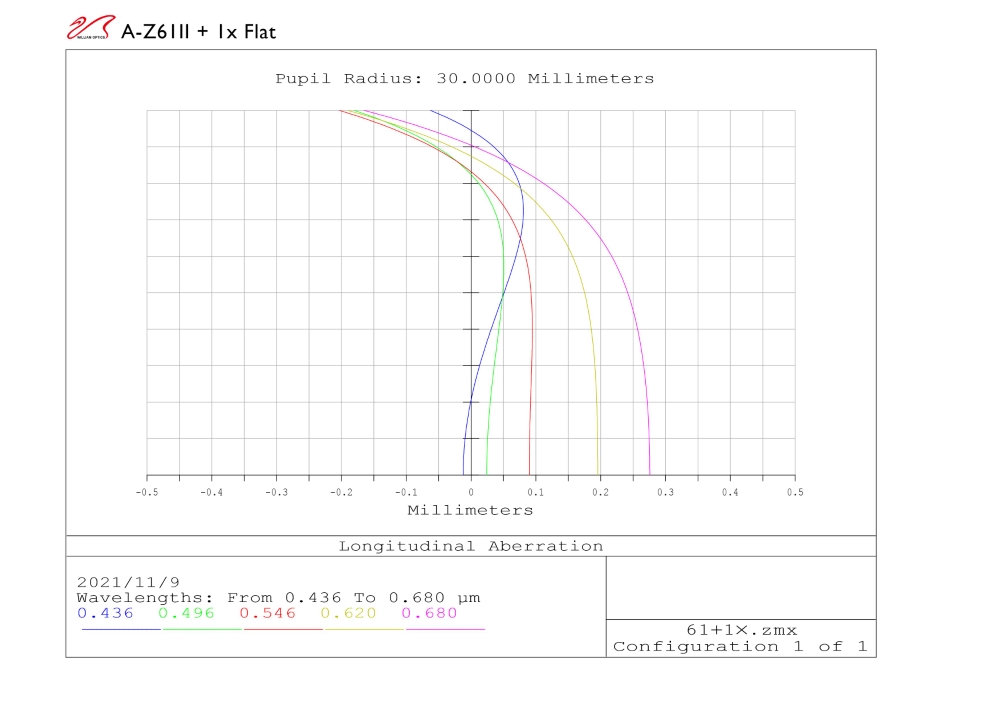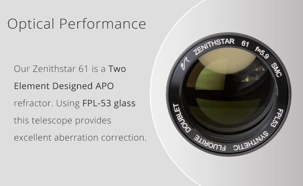 Refraktor William Optics ZS61 ED wykorzystuje dublet ze szkłem typu synthetic flourite. Tego typu instrumenty optyczne zbliżają się osiągami do kosztownych tripletów APO, przy mocno niższej cenie. Sercem tego refraktora jest obiektyw dwuelementowy φ = 61 mm, ze szkłem FPL53, o światłosile f/5,9.