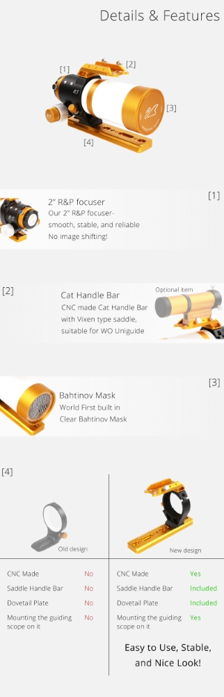 Teleskop posiada wysuwany odrośnik i stopę montażową w w standardzie Vixen, a wysoka jakość spasowania i wykończenia to od dawna wyróżnik produktów William Optics.