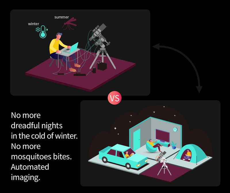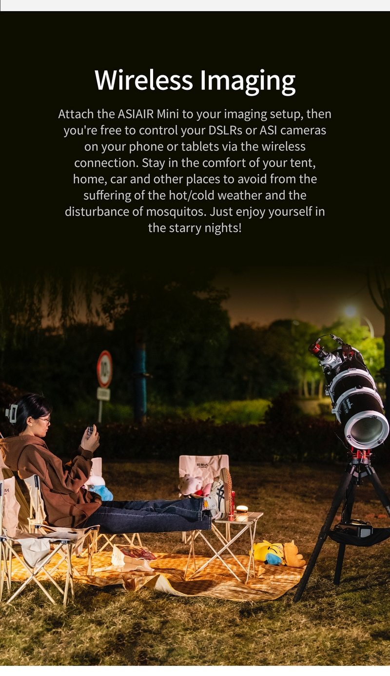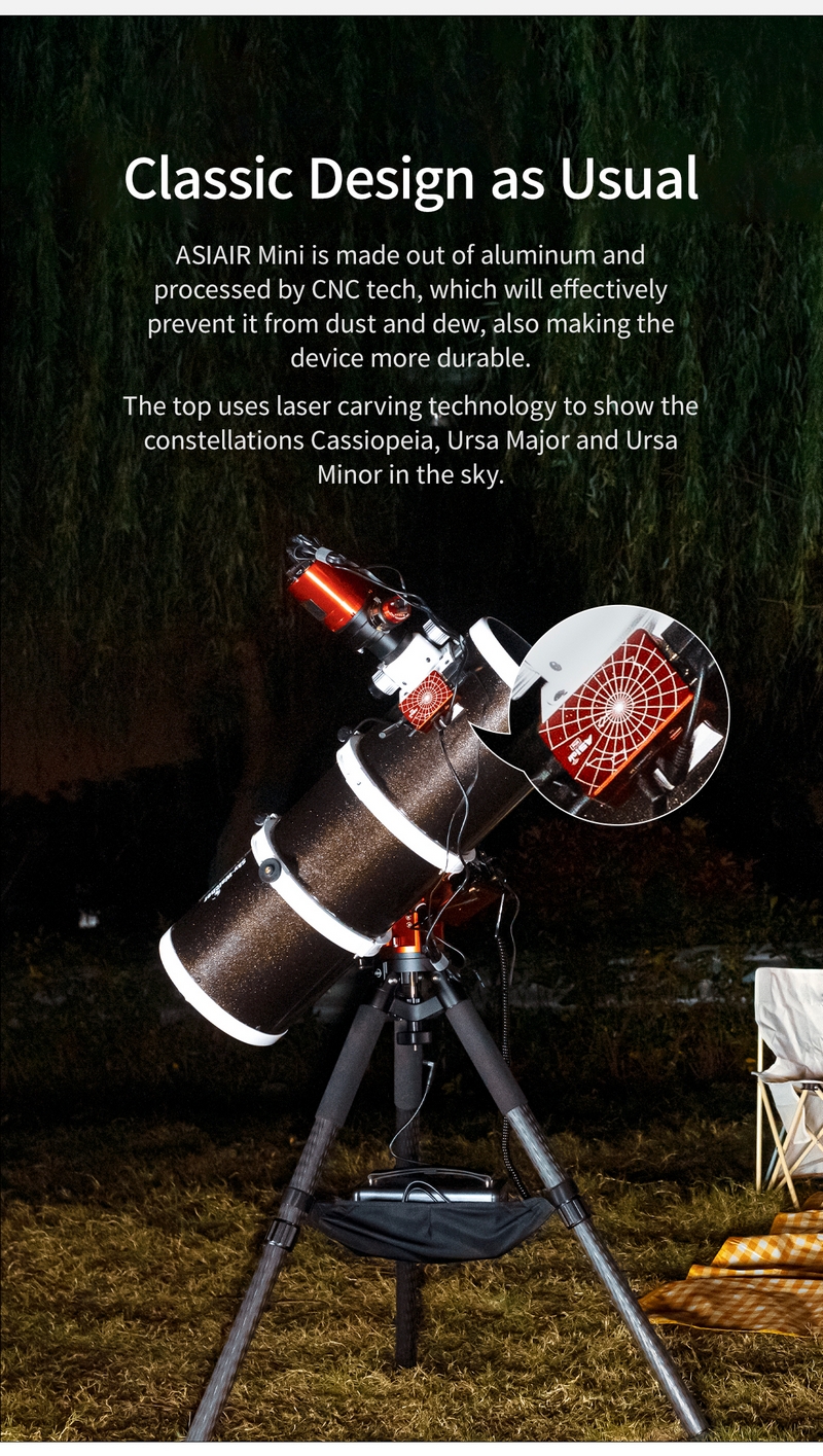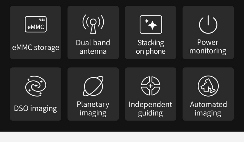 Podobnie jak w modelu ASIAIR PLUS, w wersji MINI zdecydowano się na zastosowanie układu pamięci typu eMMC, cechującego się wysoką stabilnością i niezawodnością. Łączność bezprzewodowa realizowana jest za pośrednictwem dwuzakresowego modułu WiFi z anteną zewnętrzną, gwarantującą zasięg wynoszący aż 20 metrów, dzięki czemu użytkownik może wygodnie sterować zestawem, pozostając w domu lub samochodzie, nie narażając się na działanie chłodu w jesienne czy zimowe noce.