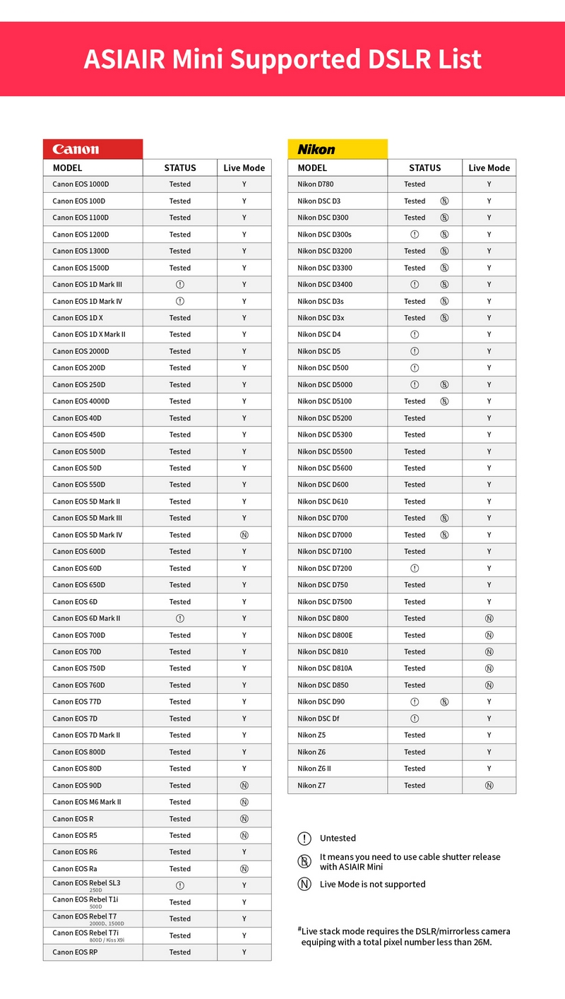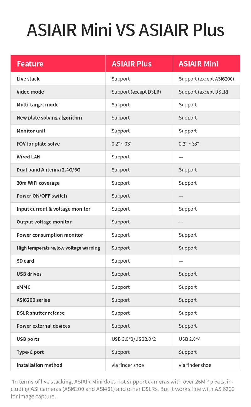 Kontroler ASIAIR MINI w odróżnieniu od wersji PLUS nie obsługuje zewnętrznych kart pamięci. Nie posiada on również złącza sieci przewodowej, a także nie wspiera funkcji Live stack dla kamery ZWO ASI6200.