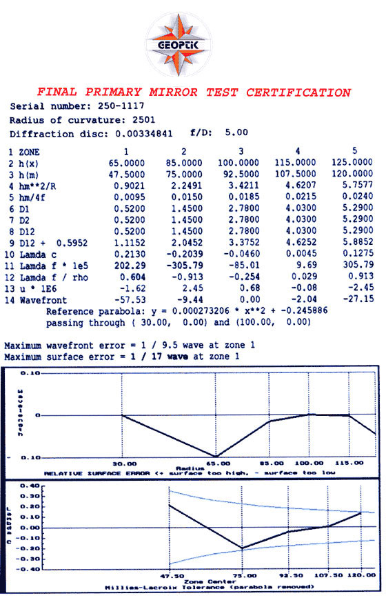 Każdy teleskop firmy Geoptik dostarczany jest z certyfikatem dokładności wykonania powierzchni optycznych zmierzonej na odpowiednich przyrządach. Pisemny certyfikat gwarantuje autentyczną dokładność czoła fali oraz powierzchni lustra. Co więcej, wraz z każdym teleskopem dostarczane są fotografie obrazów uzyskanych w czasie ostatecznego testowania elementów optycznych. Procedura ta stanowi dowód jakości wykonania optyki danego instrumentu przez firmę Geoptik.