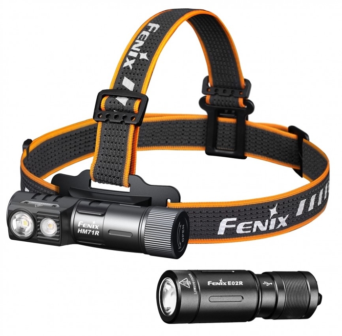 • elementy zestawu: latarka HM71R, latarka E02R, kabel USB-C, gumowa opaska, akumulator Fenix ARB-L21-5000 21700 5000 mAh, zapasowy o-ring ×1 (zapasowa uszczelka)