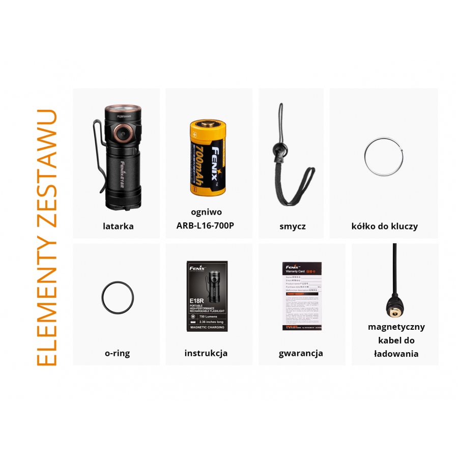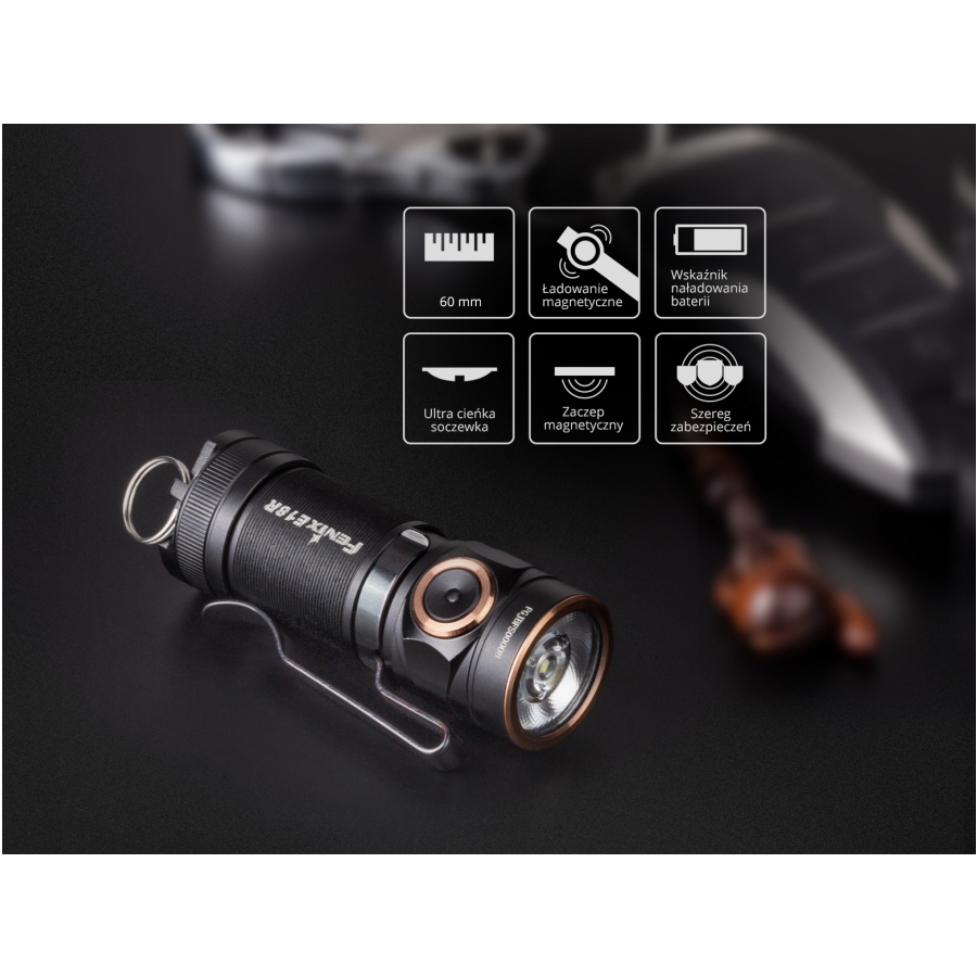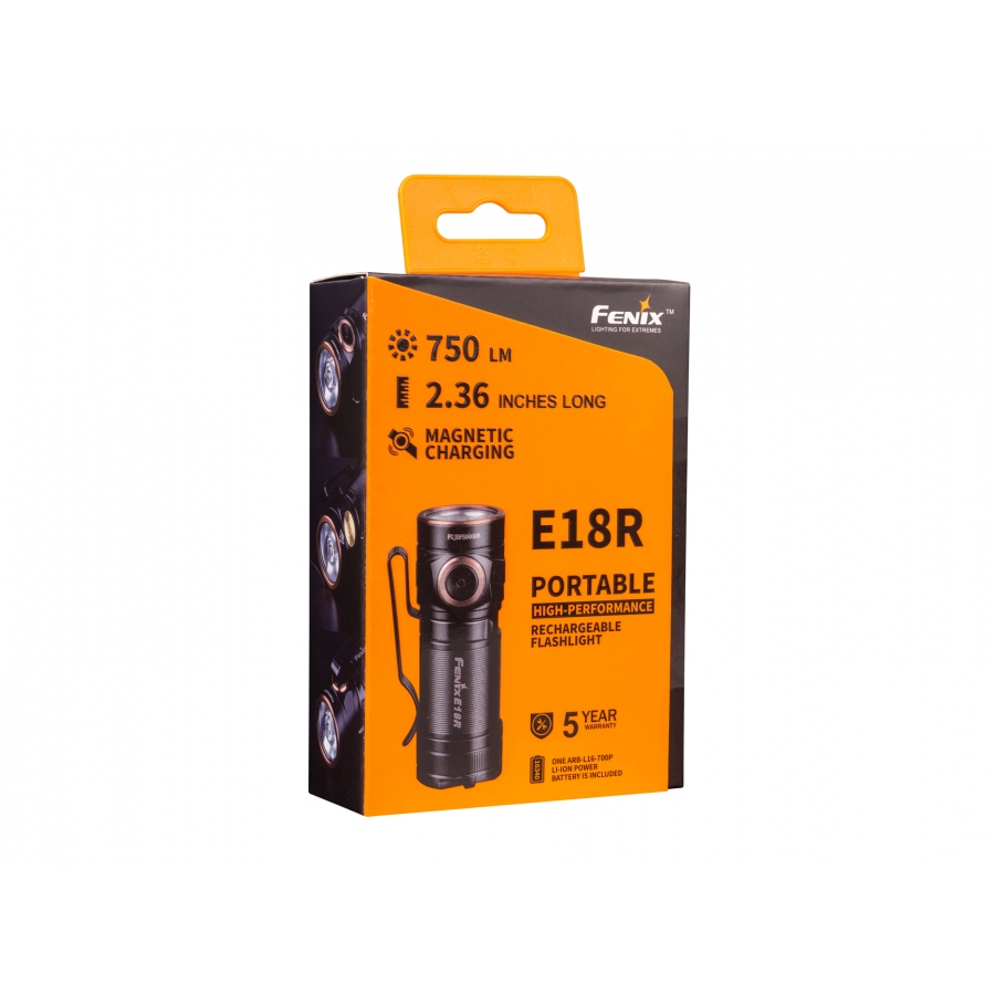 Fenix E18R to kompaktowa latarka codziennego użytku o potężnym strumieniu światła 750 lumenów oraz możliwości ładowania akumulatora za pomocą magnetycznego gniazda USB.