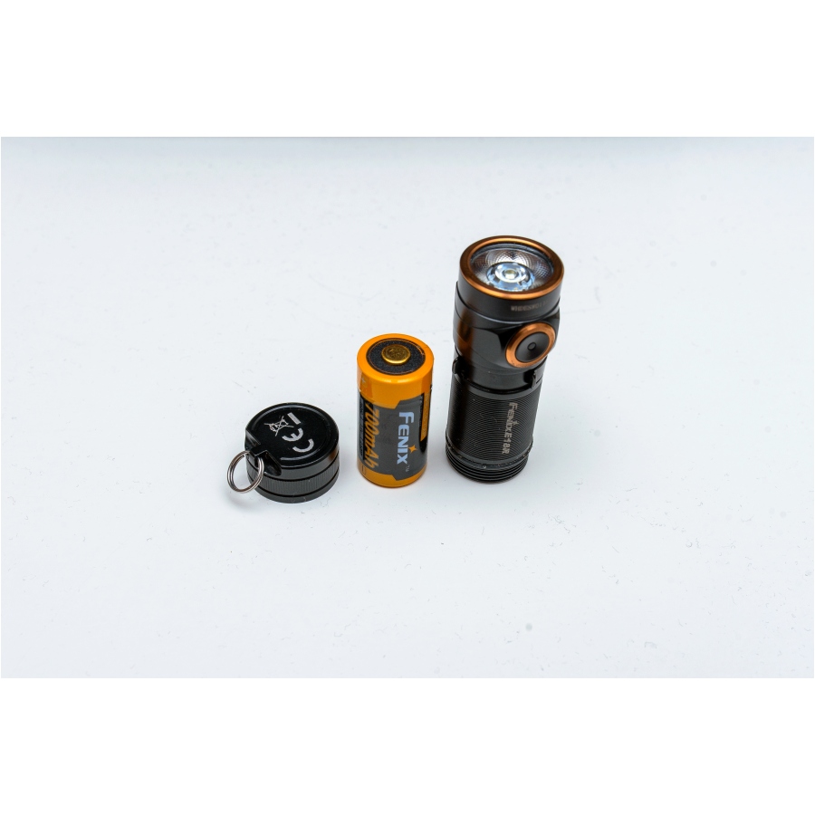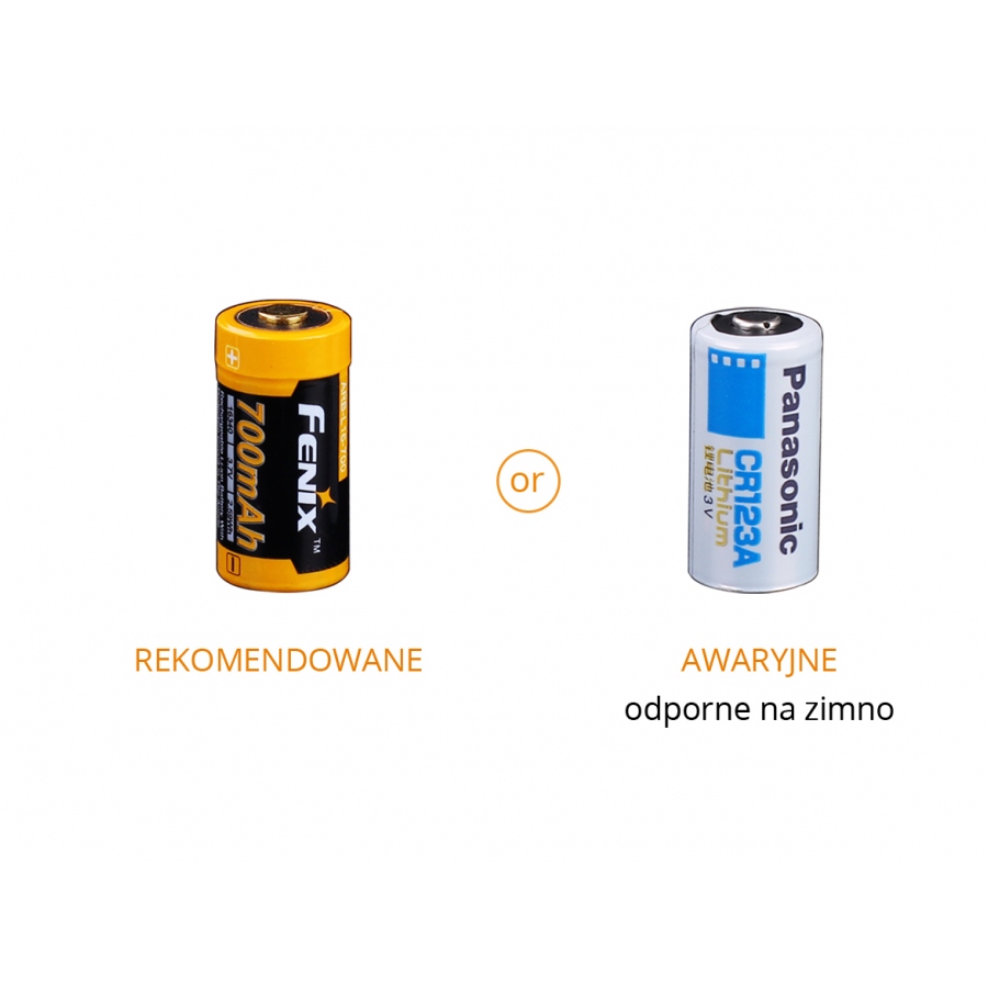 Fenix E18R może być zasilany za pomocą jednorazowej baterii CR123 lub ładowalnego akumulatora 16340, który zapewnia lepsze parametry świecenia oraz minimalizuje koszty związane z eksploatacją latarki.