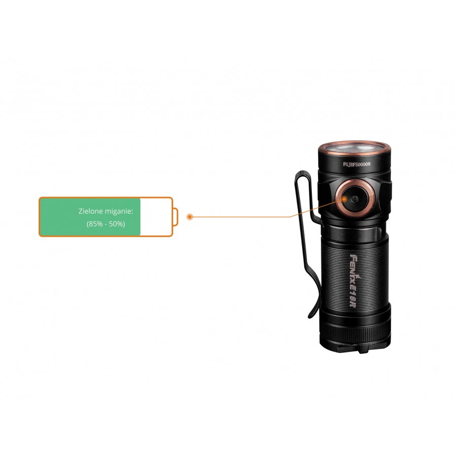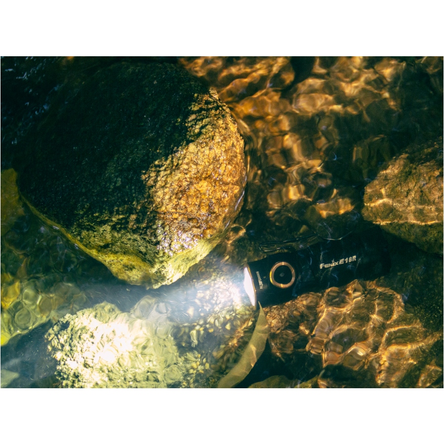 W latarce E18R znajduje się także diodowy wskaźnik poziomu baterii, zabezpieczenie przed przegrzaniem oraz odwróconą polaryzacją. Latarka ma wysoką klasę szczelności IP68, jest zatem odporna na pełne zanurzenia wodzie na głębokości 2 m oraz upadek z wysokości 1 m.