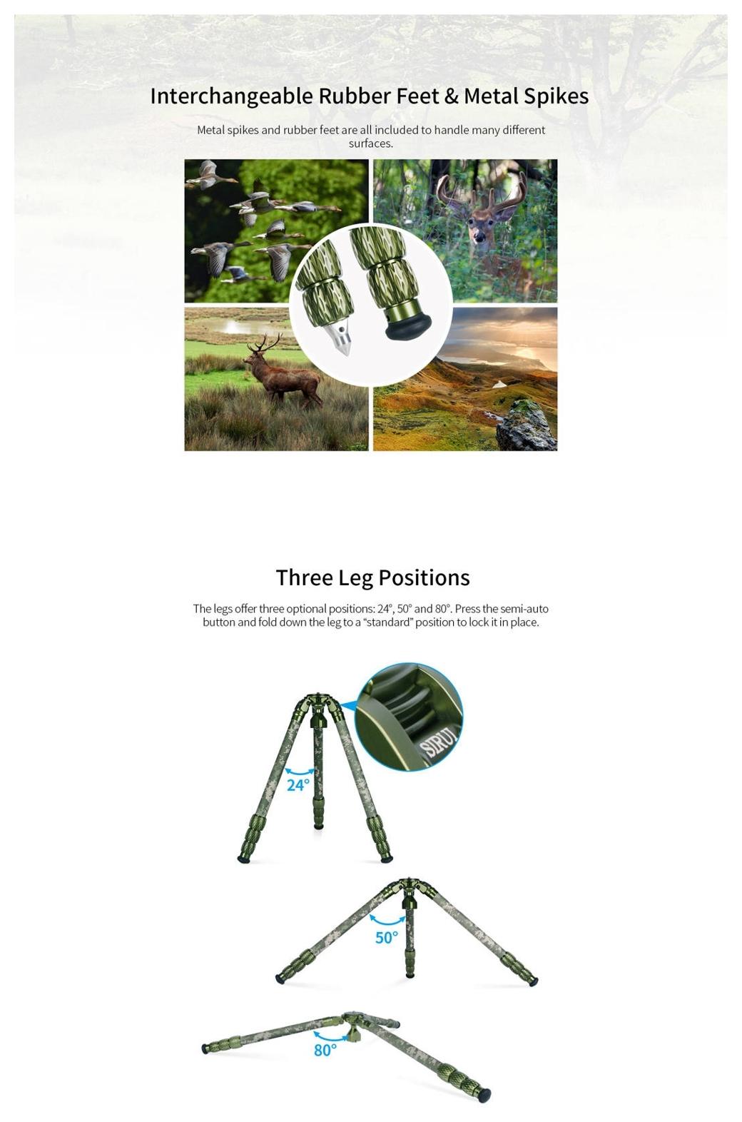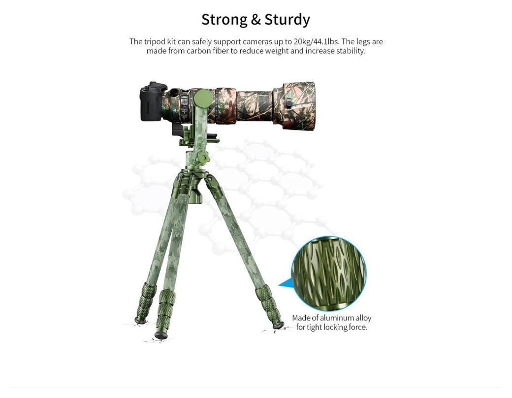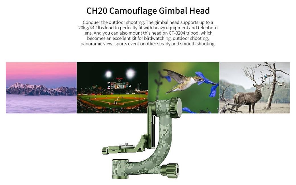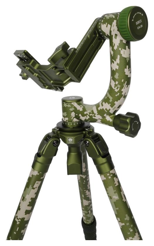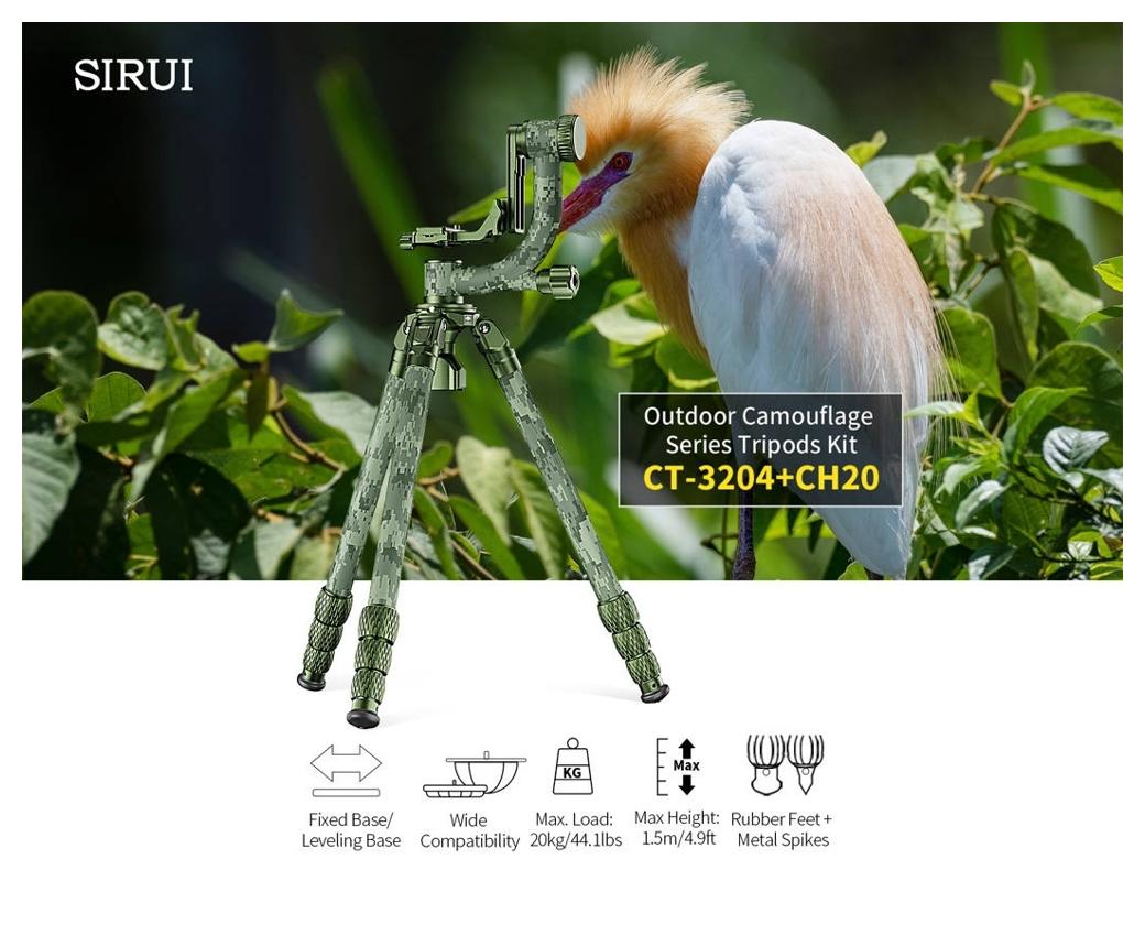 Sirui Carbon Tripod + Gimbal Head Kit CT-3204 + CH20 Camouflage (SKU: 124869 / CT-3204 + CH20) to zestaw statywu z włókna węglowego oraz głowicy gimbalowej w wersji kamuflażowej, zaprojektowany do pracy z ciężkimi teleobiektywami podczas fotografii i obserwacji przyrody.