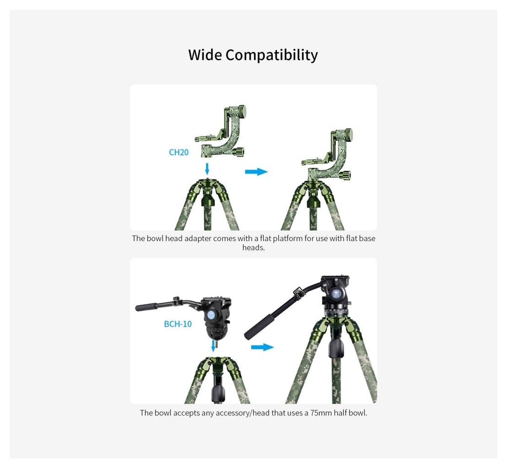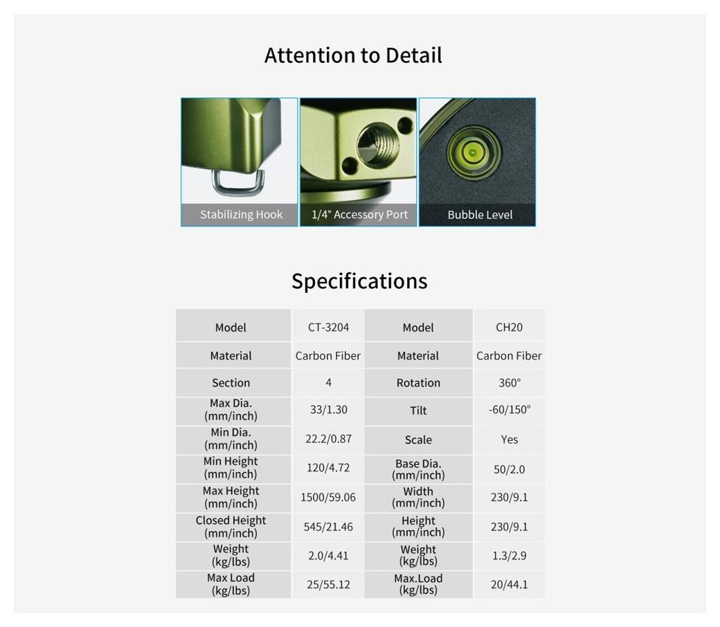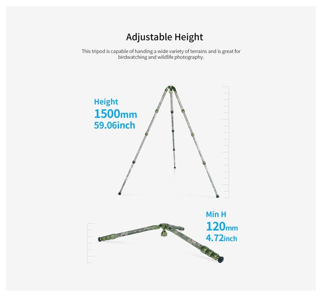 Sirui Carbon Tripod + Gimbal Head Kit CT-3204 + CH20 Camouflage (SKU: 124869 / CT-3204 + CH20) to zestaw statywu z włókna węglowego oraz głowicy gimbalowej w wersji kamuflażowej, zaprojektowany do pracy z ciężkimi teleobiektywami podczas fotografii i obserwacji przyrody.