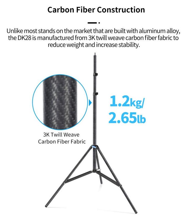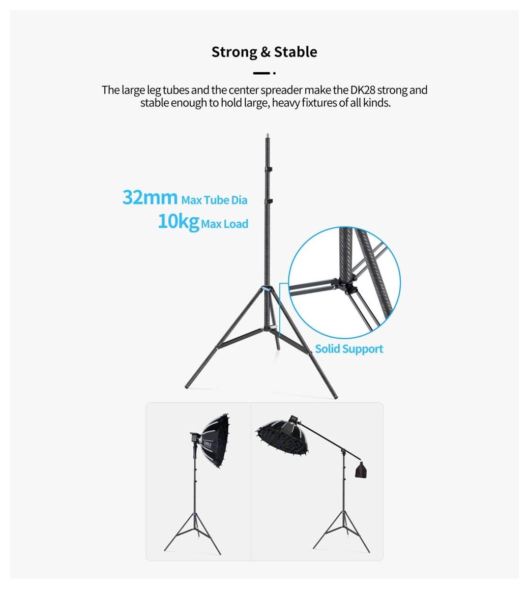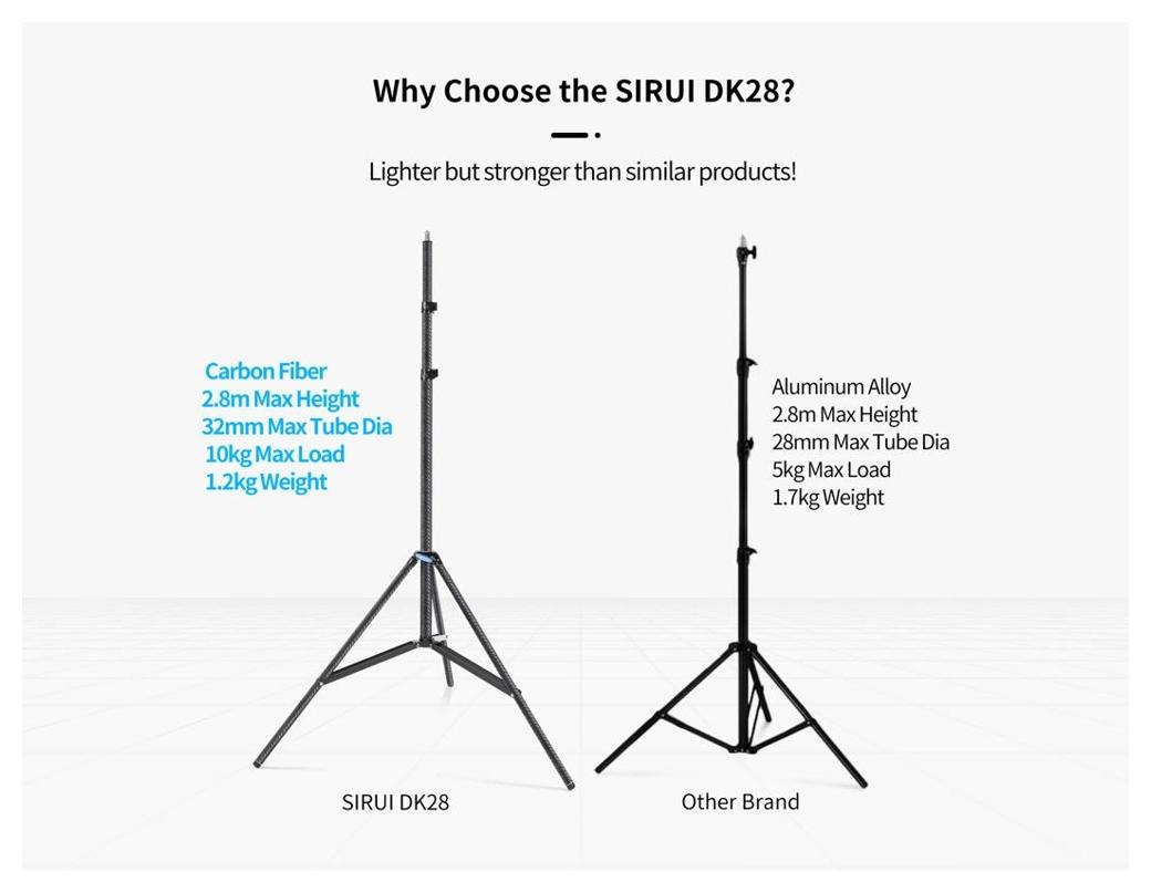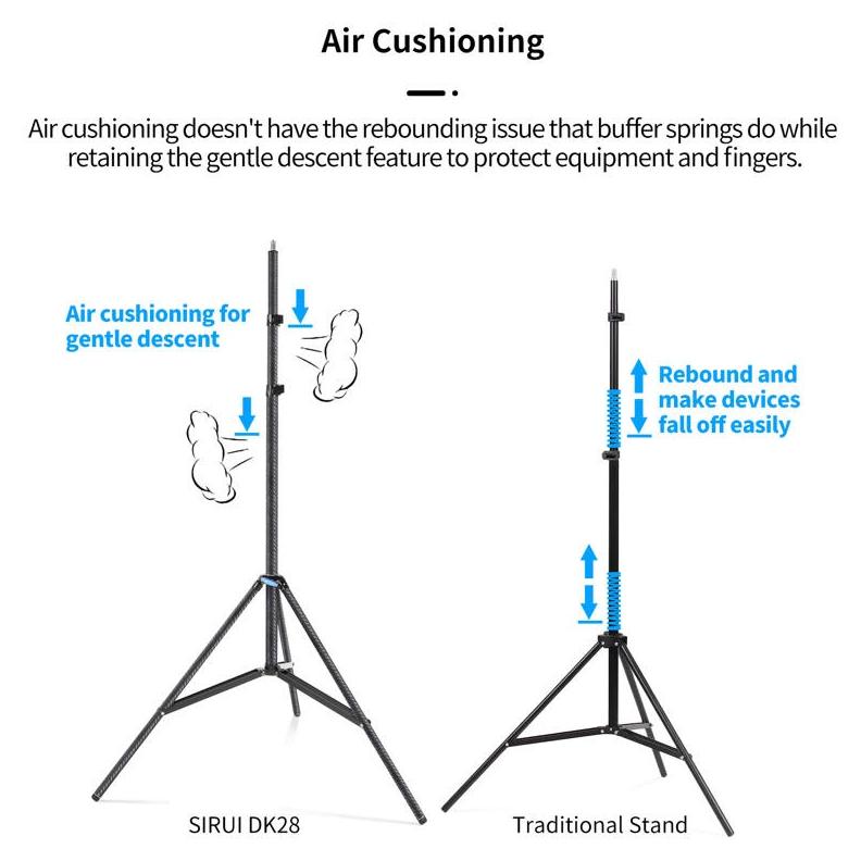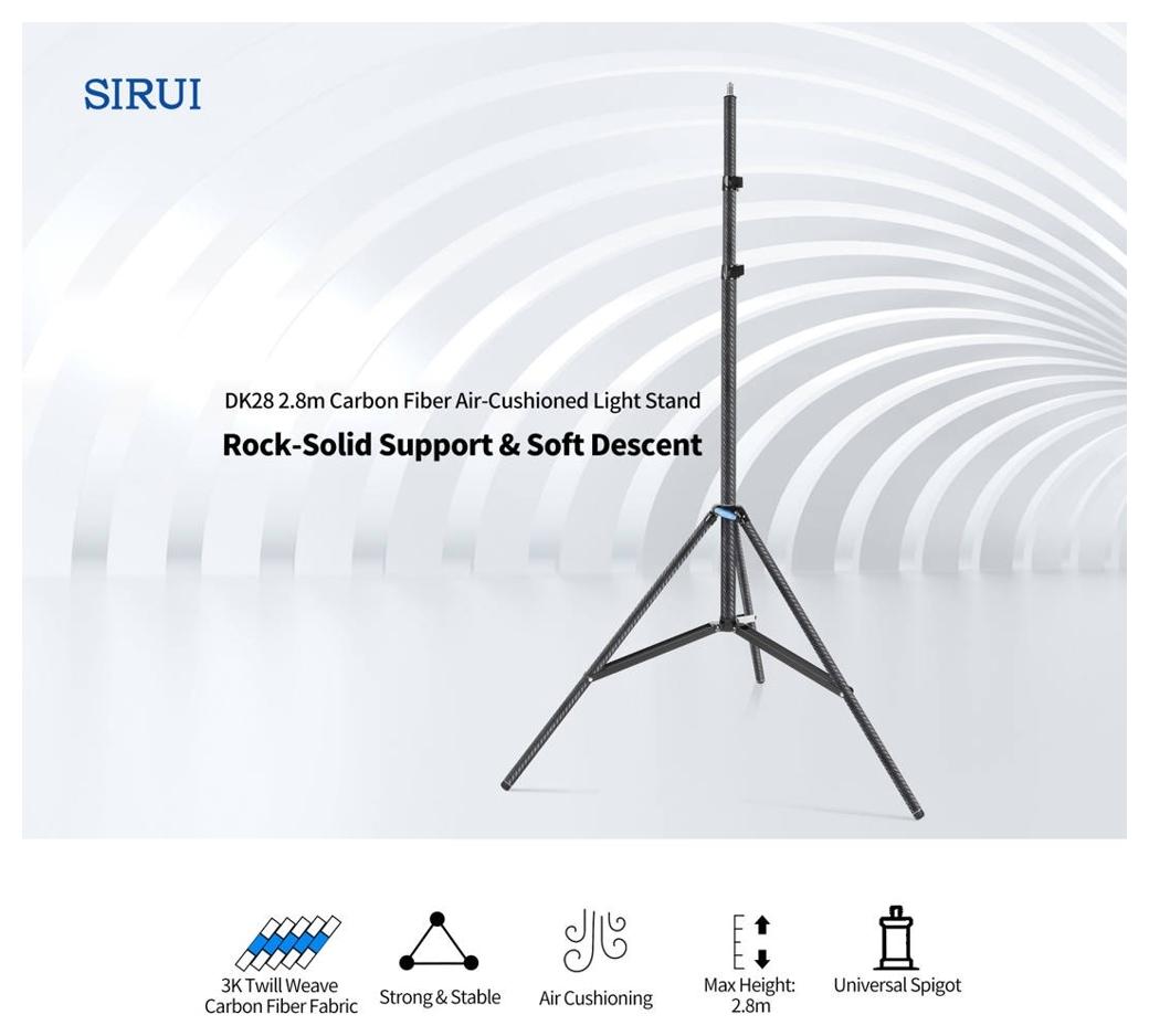 Sirui Light Stand DK-28 Carbon Fiber Air-Cushioned (Sirui, SKU: 124267 / DK-28) to profesjonalny statyw oświetleniowy wykonany z włókna węglowego, przeznaczony do pracy z ciężkimi lampami i panelami LED. Konstrukcja z dużymi rurami nóg oraz szerokim rozstawem zapewnia wysoką stabilność przy zachowaniu niskiej masy.