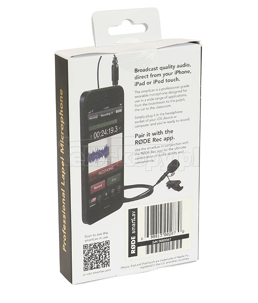 SmartLav to profesjonalnej klasy, przypinany mikrofon przeznaczony do użycia na planie filmowym, w telewizji lub w studio transmisyjnym. Ten mikrofon to idealne rozwiązanie w sytuacjach, gdy wymagana jest najwyższa jakość dźwięku, a jednocześnie trzeba zastosować dyskretne omikrofonowanie, bez dodatkowego osprzętu i widocznych kabli. Użytkownik smartLav po prostu przypina mikrofon w wygodnym miejscu, i po podłączeniu go do smartfona albo tabletu może nagrywać dźwięk za pomocą aplikacji RØDE Rec dla systemu iOS, lub innej, dowolnej aplikacji do nagrywania.