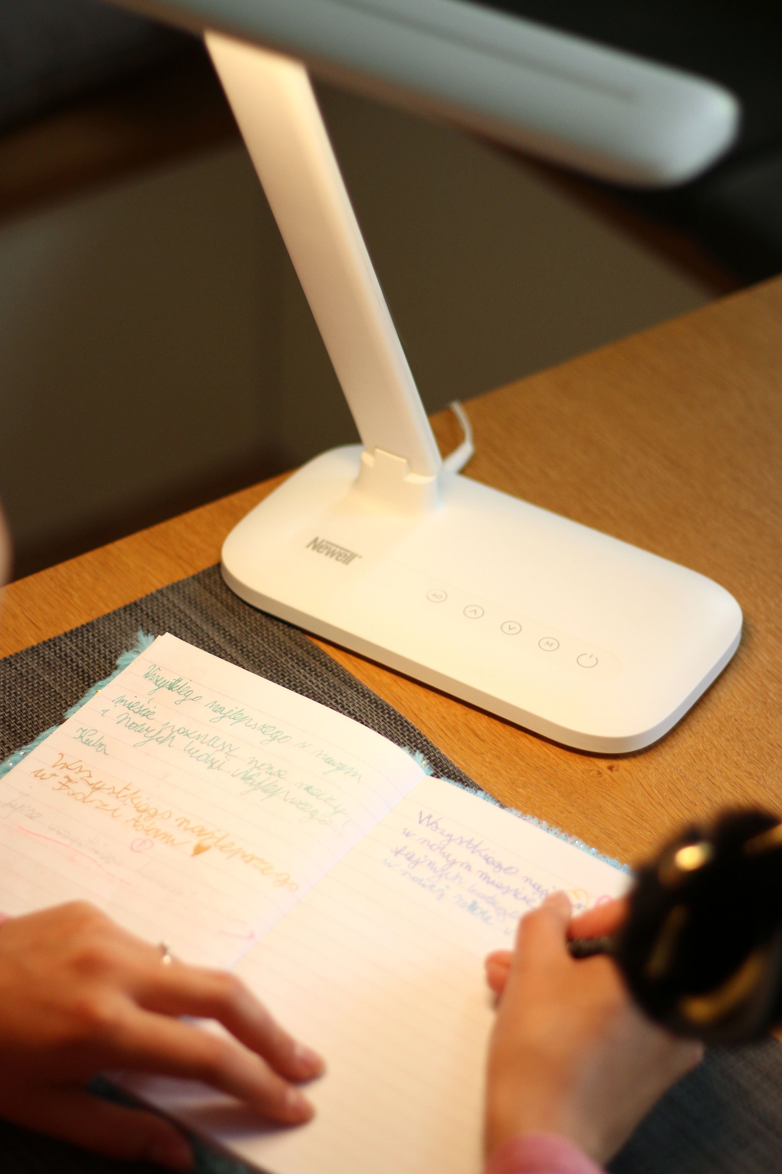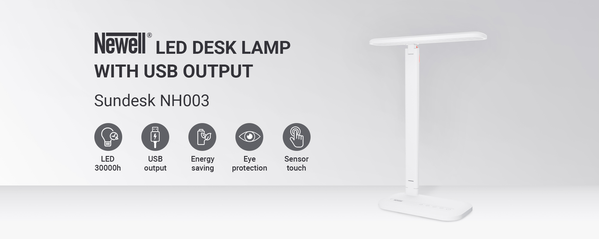 Lampka biurkowa LED Newell Sundesk NH003 zapewnia idealne warunki oświetleniowe do pracy, nauki i odpoczynku. Prosty panel sterowania umożliwia regulowanie temperatury barwowej światła oraz stopnia przyciemnienia. Urządzenie jest niezwykle energooszczędne, posiada wyłącznik czasowy. W podstawce lampy znajdziemy dodatkowe wyjście USB, dzięki któremu podładujemy nasz smartfon lub inne urządzenie elektroniczne.