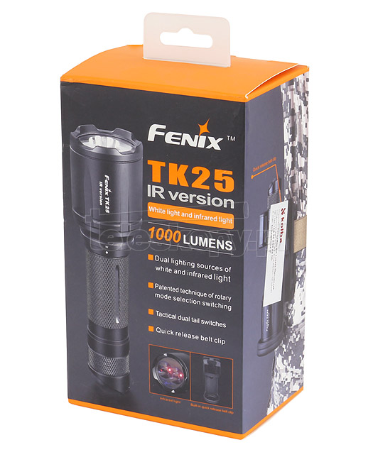 Fenix TK25 IR to propozycja latarki dedykowanej specjalnie dla wojska oraz dla branży myśliwskiej. Po raz pierwszy w latarce zostało wykorzystane światło podczerwone o maksymalnej mocy 3 W oraz o długości fali 850 nm. Dzięki odpowiednio dobranej długości fali latarka może służyć jako iluminator diodowy w zakresie wspomagania noktowizji, a co najważniejsze jej światło nie jest widoczne dla oka ludzkiego i nie płoszczy zwierzyny.