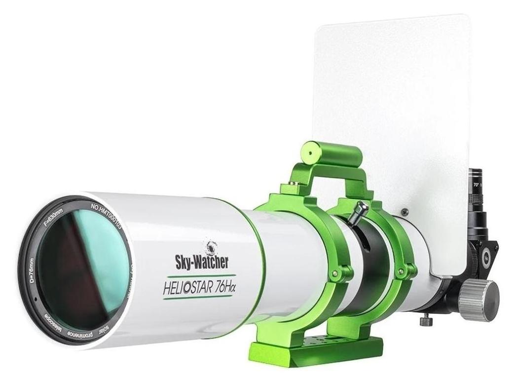Teleskop słoneczny Sky-Watcher HELIOSTAR-76Ha (SW-3503) to bezpieczne urządzenie do obserwacji protuberancji słonecznych oraz innych szczegółów powierzchni Słońca w paśmie H-alfa. Oferuje wyjątkową wydajność poniżej 0,5 angstremów, porównywalną z modułami podwójnych etalonów „Double-Stack”.