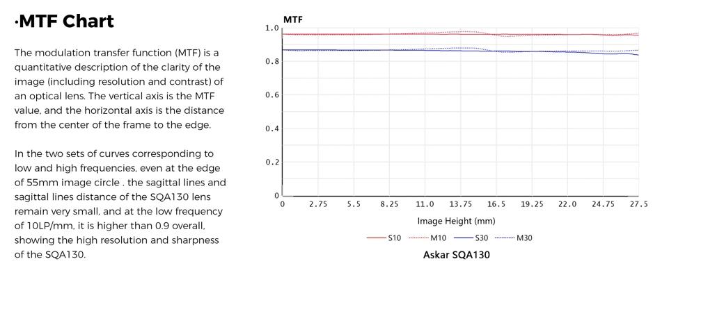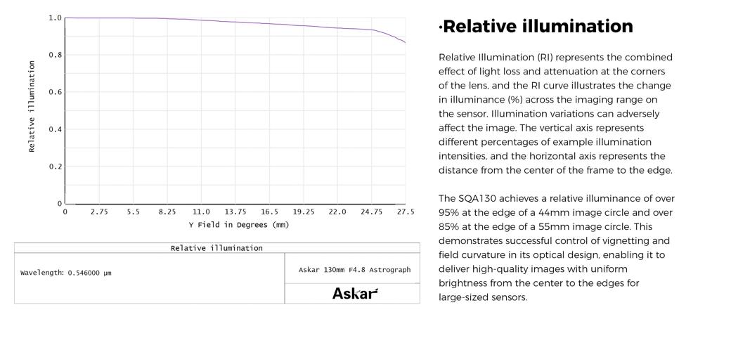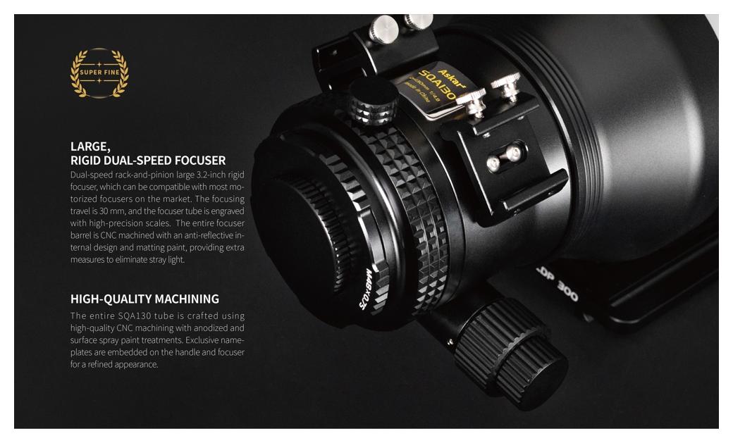Askar SQA130 f/4,8 130/624 to profesjonalny astrograf oparty na konstrukcji Petzvala, zaprojektowany do współpracy z kamerami i aparatami pełnoklatkowymi oraz średnioformatowymi. Układ optyczny składa się z pięciu soczewek, w tym dwóch wykonanych ze szkła superniskodyspersyjnego (SD), co zapewnia wysoki kontrast, znakomitą ostrość gwiazd i skuteczną korekcję aberracji chromatycznych. Konstrukcja Petzvala eliminuje konieczność obliczania dystansu roboczego – astrograf jest fabrycznie spłaszczony i gotowy do pracy z rekomendowaną odległością montażową.