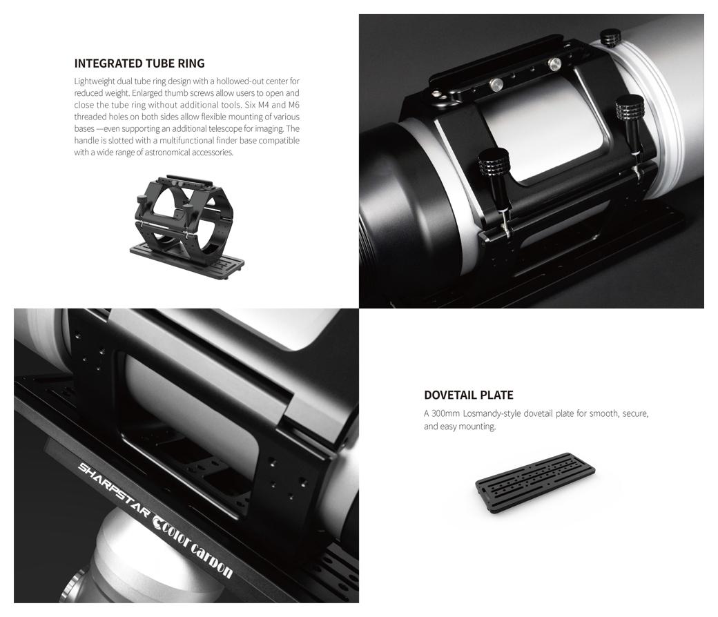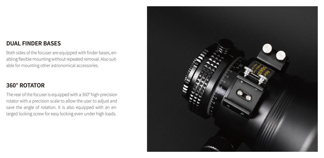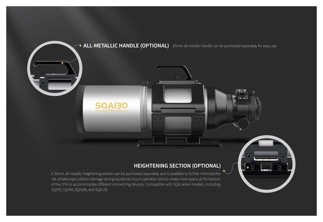 SQA130 charakteryzuje się również rozbudowaną częścią mechaniczną, umożliwiającą komfortową pracę oraz łatwą integrację z różnymi zestawami astrofotograficznymi. Tylny moduł wyposażony jest w adaptery gwintowe M48 / M54 / M68, co pozwala na szerokie możliwości konfiguracji. Astrograf wspiera format obrazowania pełnoklatkowy (44 mm) oraz średnioformatowy (55 mm), zapewniając równomierną iluminację pola.
