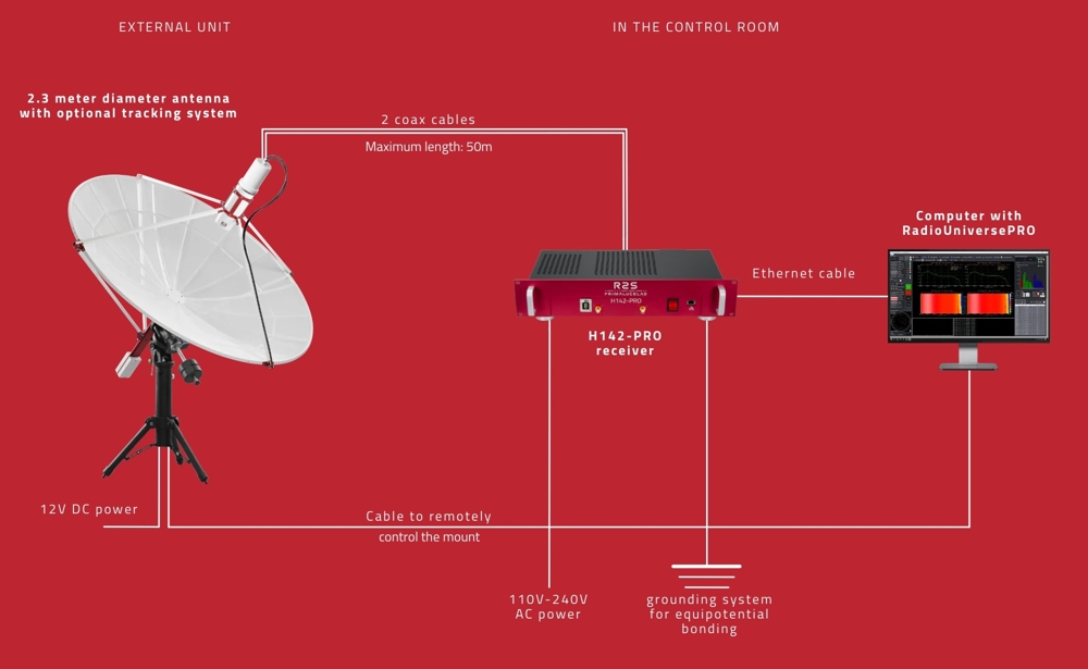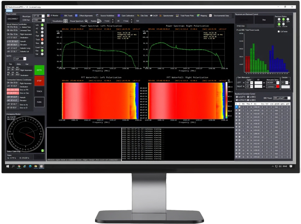 • oprogramowanie RadioUniversePRO dla Windows 10/11 umożliwiające pełną kontrolę radioteleskopu i akwizycję danych