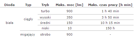 • maksymalny czas świecenia [h min] - 150 h