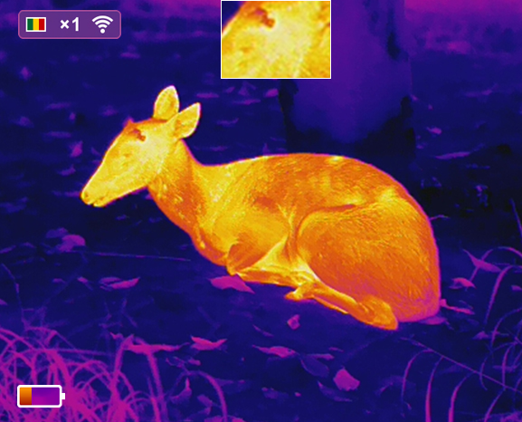 Obraz w obrazie poprawia dostrzegalność szczegółów, zapewniając 2-krotnie powiększony obraz obszaru matrycy w górnej części wyświetlacza. Pomaga powiększyć cel, zachowując pozostałą część widocznego pola widzenia.
