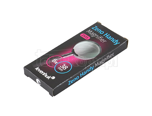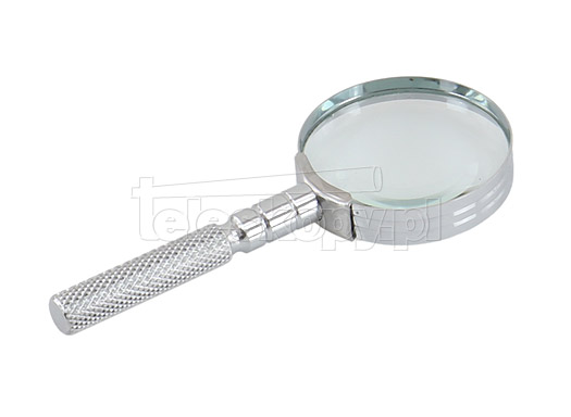 Ręczna lupa do czytania o 6-krotnym powiększeniu i średnicy soczewki 38 mm. Oprawa i rączka wykonane z metalu, optyka szklana.