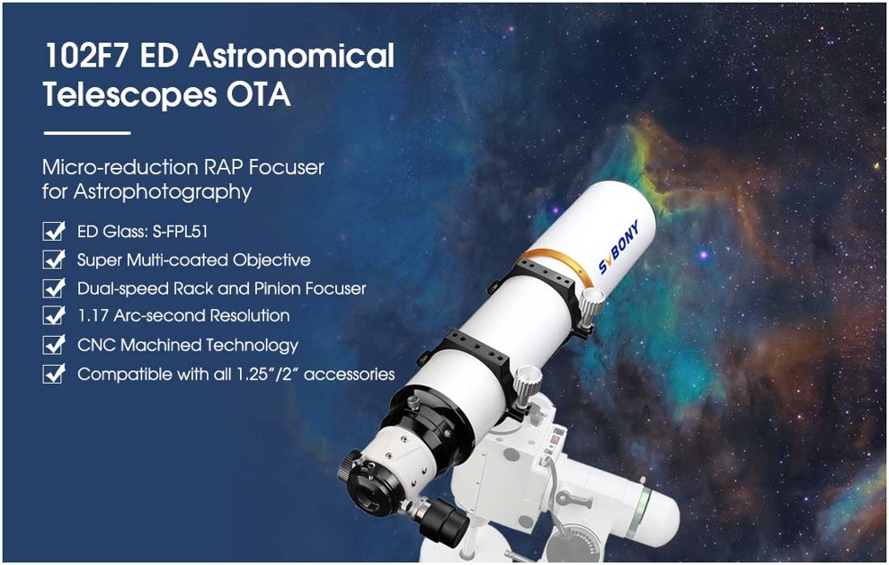 SVBONY SV503 102 mm ED F/7 to profesjonalna tuba optyczna o znakomitej zdolności rozdzielczej, dużym zasięgu gwiazdowym i innych parametrach zoptymalizowanych pod kątem zastosowania w astrofotografii.