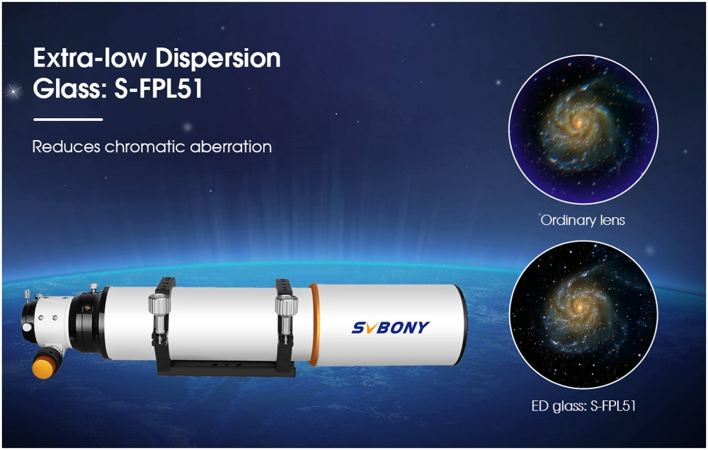 SVBONY SV503 102 mm ED F/7 to klasyczny refraktor z układem soczewek tworzących dublet. W celu jak najlepszej korekcji głównej wady optycznej teleskopów soczewkowych, a więc aberracji chromatycznej, optyka tego instrumentu wyposażona została w soczewkę wykonaną ze szkła niskodyspersyjnego (ED) typu S-FPL51, stanowiącego jeden z flagowych produktów japońskiej firmy Ohara, znanej z wytwarzania najlepszych gatunków szkieł optycznych. Za eliminację odblasków i poprawę kontrastu obrazu odpowiedzialna jest powłoka Ultra-wideband coating (SMC).