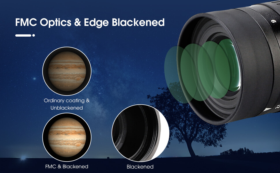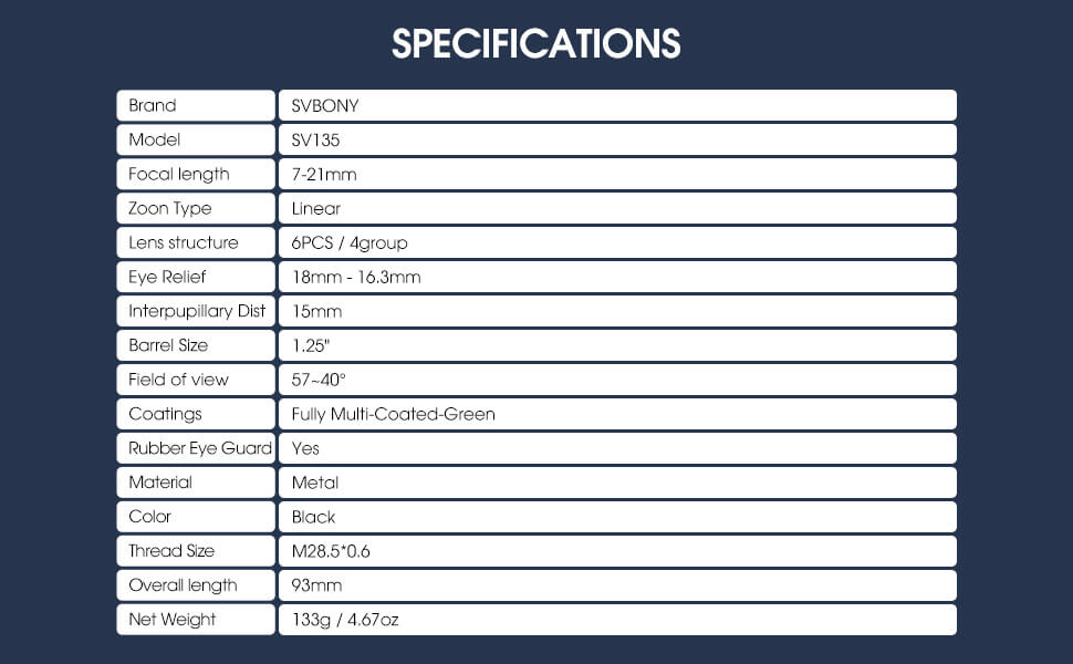 Svbony SV135 7-21 mm 1,25" to okular o zmiennej ogniskowej 7 - 21 mm i pozornym polu widzenia wynoszącym 40 - 57°. W celu zapewnienia odpowiednio wysokiego kontrastu i znakomitej szczegółowości wszystkie soczewki pokryte zostały pełną powłoką wielowarstwową (FMC), a ich brzegi dodatkowo zaciemniono, co pozwoliło na zminimalizowanie ryzyka powstawania wewnętrznych odbić światła.