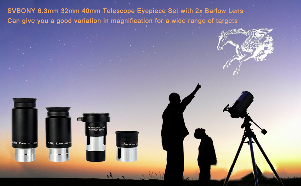 Zestaw okularów Svbony (SKU: W2623A) to praktyczny komplet akcesoriów do teleskopów astronomicznych z gniazdem 1,25". W jego skład wchodzą trzy okulary Plössl o ogniskowych 6,3 mm, 32 mm i 40 mm oraz soczewka Barlowa 2x. Zestaw umożliwia uzyskanie szerokiego zakresu powiększeń oraz zapewnia dobrą jakość obrazu zarówno przy obserwacjach nocnych, jak i dziennych.