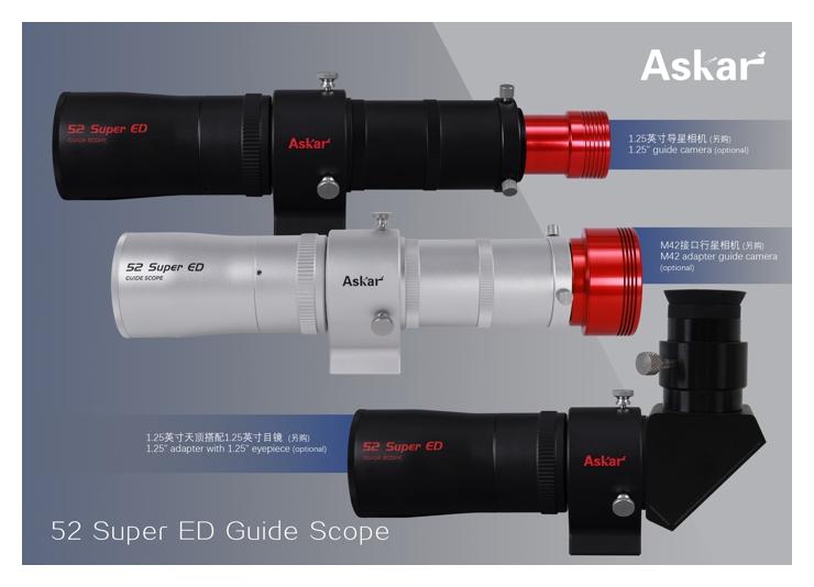 Askar 52 mm Super ED guide scope silver to guider przeznaczony do zastosowań profesjonalnych, którego apertura pozwala zbierać niemal 164% więcej światła niż w modelu Askar Guide Scope 32 mm f/4, co jednocześnie przekłada się na zasięg gwiazdowy wynoszący mag 10,4. Oprócz zastosowania w astrofotografii guider ten po doposażeniu w opcjonalny adapter można wykorzystać w obserwacjach wizualnych.
