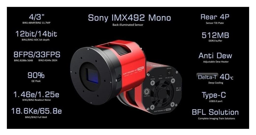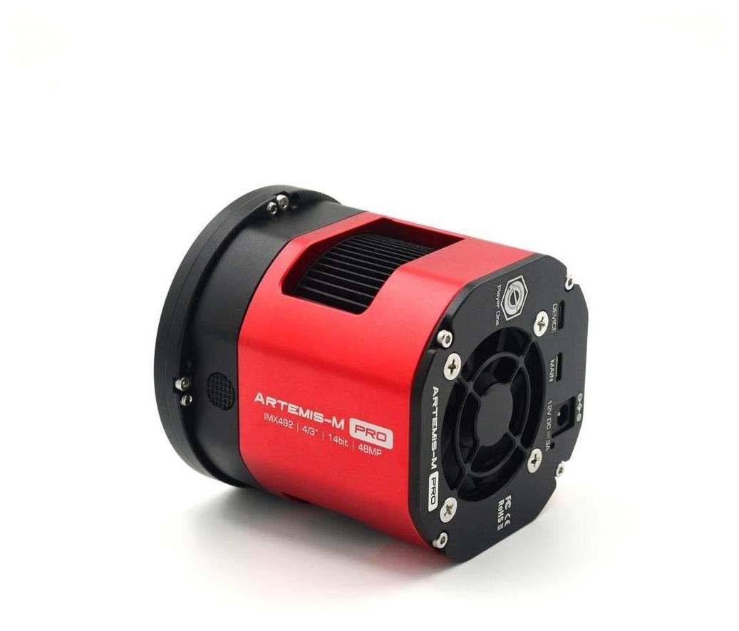 Player One ARTEMIS-M PRO Mono (SKU: POA-ARTEMIS-M-PRO) to chłodzona kamera mono o rozdzielczości aż 47 MP, oparta na sensorze Sony IMX492 w formacie 4/3″. Ultramały piksel 2,315 µm i 14-bitowy przetwornik ADC zapewniają wyjątkową szczegółowość zdjęć szerokich pól, a 2-stopniowe chłodzenie TEC obniża temperaturę matrycy o ≈40 °C względem otoczenia, minimalizując szum termiczny przy wielogodzinnych ekspozycjach mgławic i galaktyk.