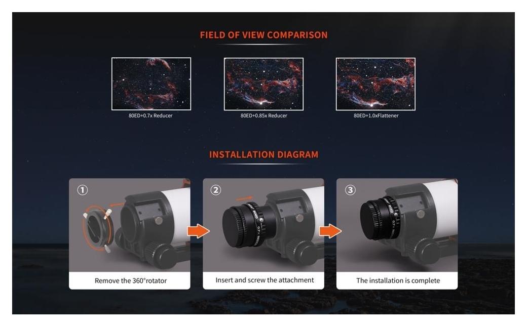 Teleskop Askar 80ED oferowany jest z trzema opcjonalnymi akcesoriami do astrofotografii: reduktorem 0.7x, reduktorem 0.85x oraz korektorem pola 1.0x (flattenerem). Użytkownik może dobrać odpowiedni element optyczny w zależności od potrzeb podczas obserwacji i fotografowania obiektów przy pomocy teleskopu 80ED.